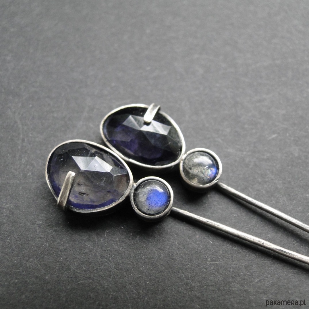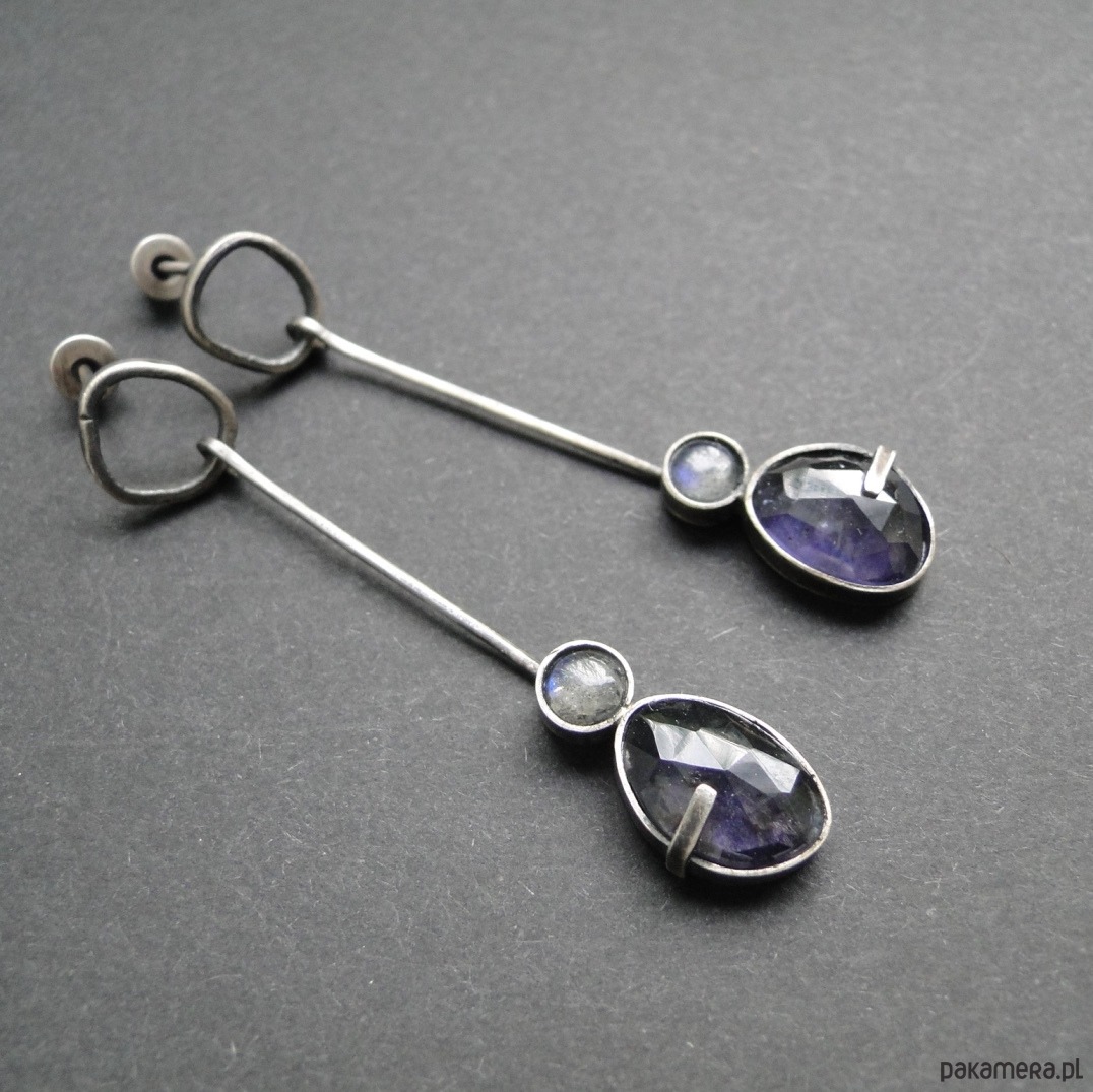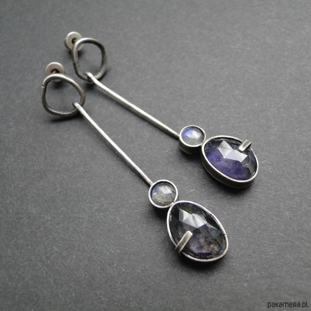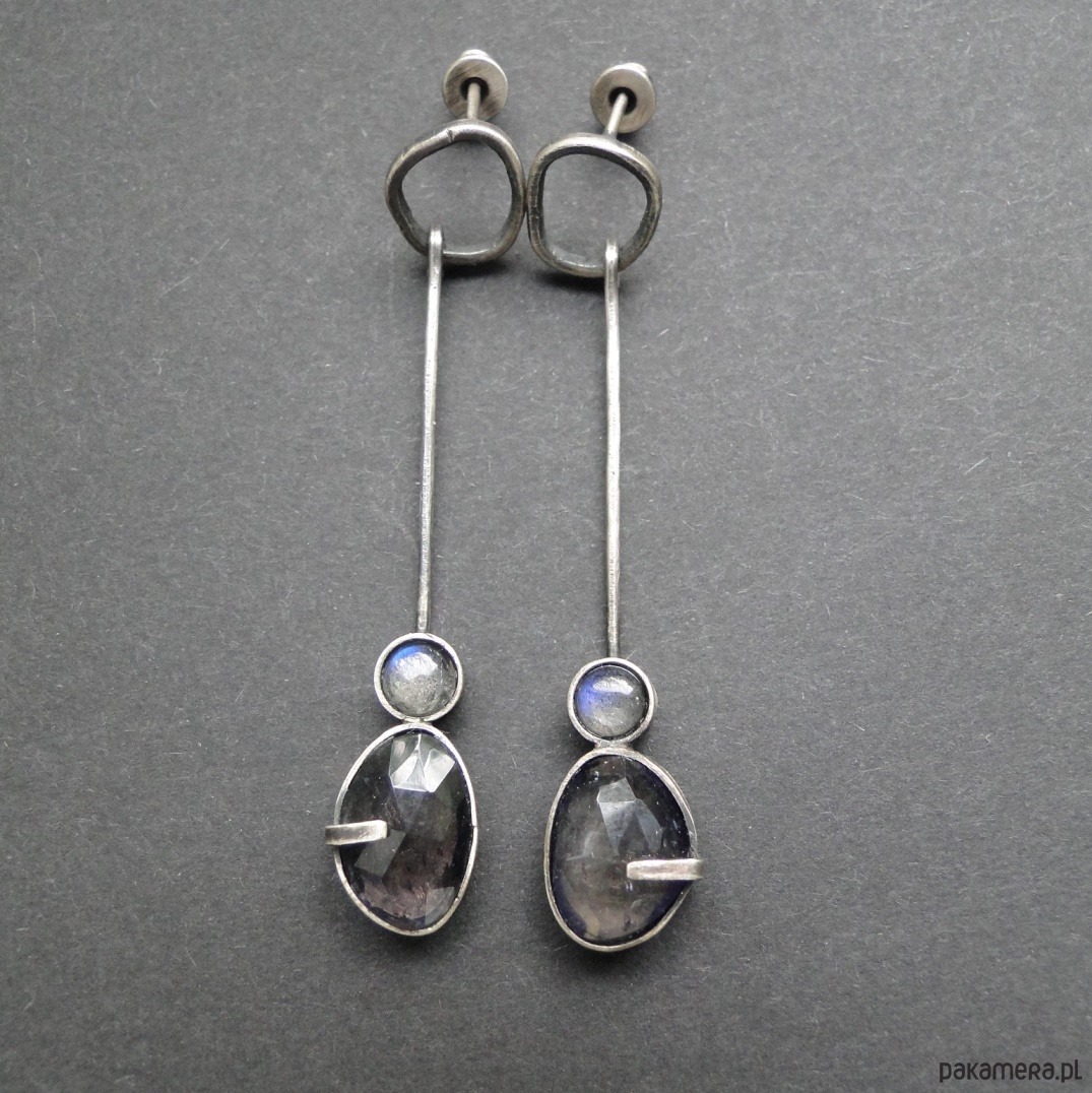Surowe, długie kolczyki wykonane ręcznie w całości. Srebro 925,oksydowane i szorowane. Kamienie: wysokiej klasy Iolit dł.13 i 14 mm; labradoryt śr.5 mm z niebieską poświatą. Iolit jest w kolorze jasnego granatu,kamienie niesymetryczne, podobnie jak same sztyfty ręcznie wykonane. Długość kolczyka- 6 cm. Nie moczyć w wodzie.