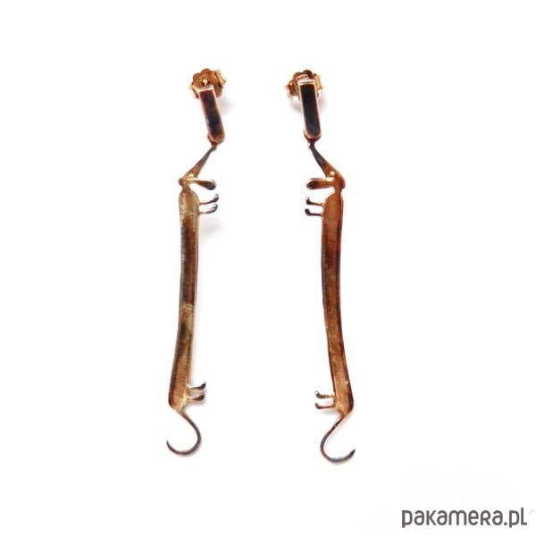 Zabawne i oryginalne kolczyki srebrne w kształcie wesołych jamniczków. Tutaj w wersji na sztyftach. Całość została zoksydowana i porysowana nadając kolczykom ciekawy efekt. Waga: 3,7 gr.
