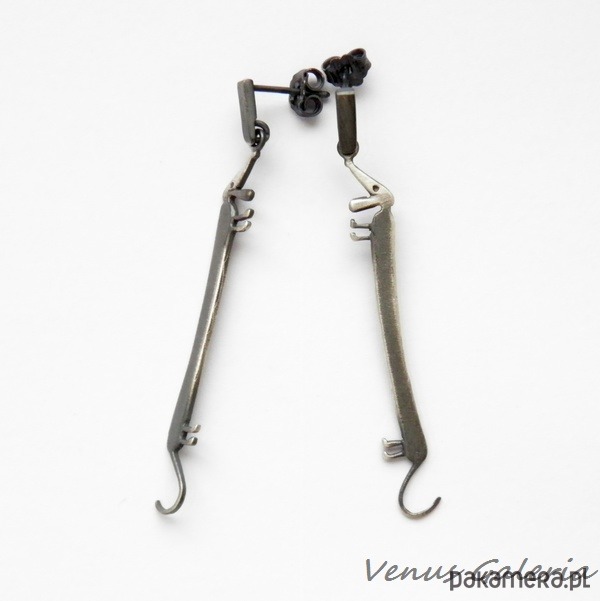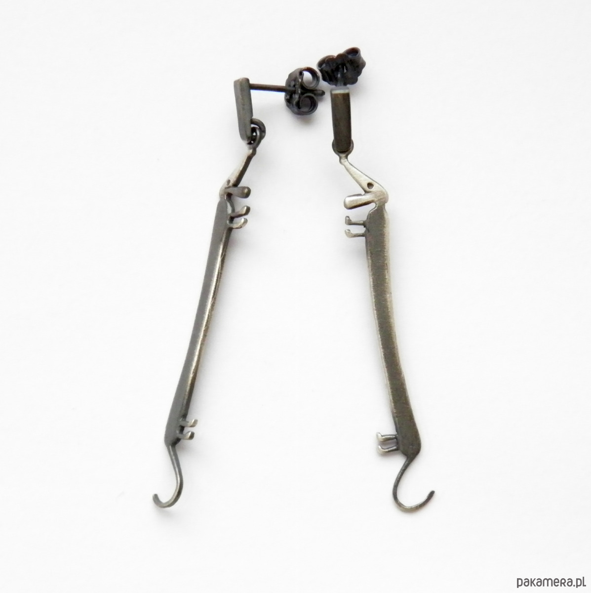 Zabawne i oryginalne kolczyki srebrne w kształcie wesołych jamniczków. Tutaj w wersji na sztyftach. Całość została zoksydowana na grafitowy kolor. Waga: 3,7 gr.