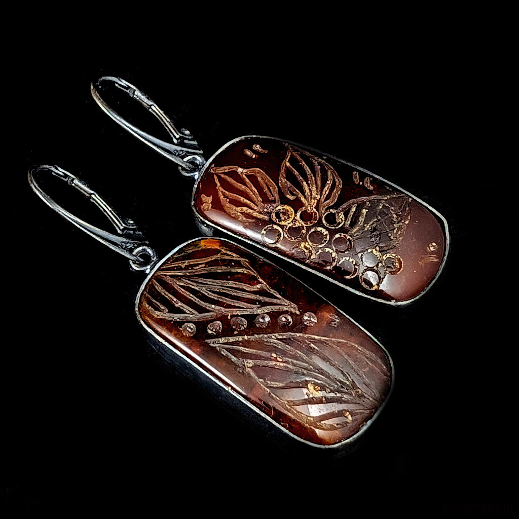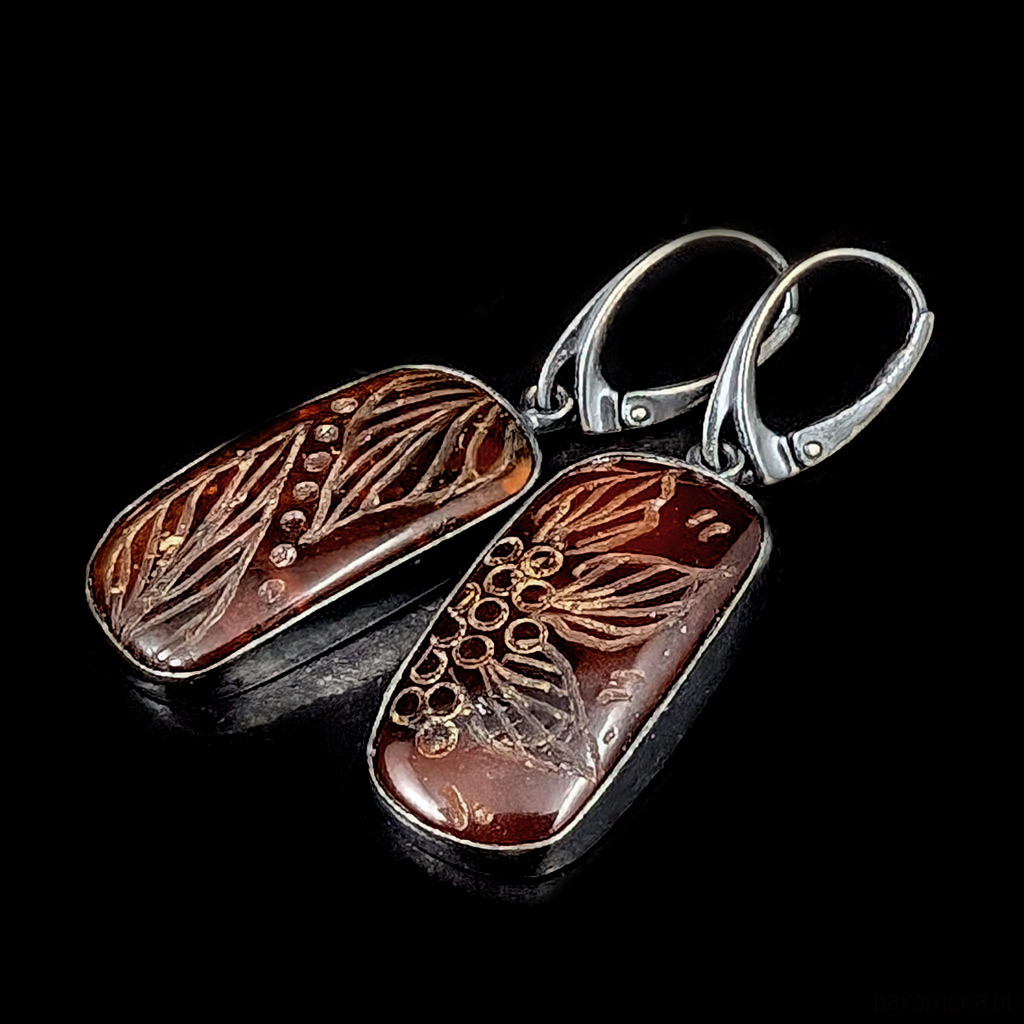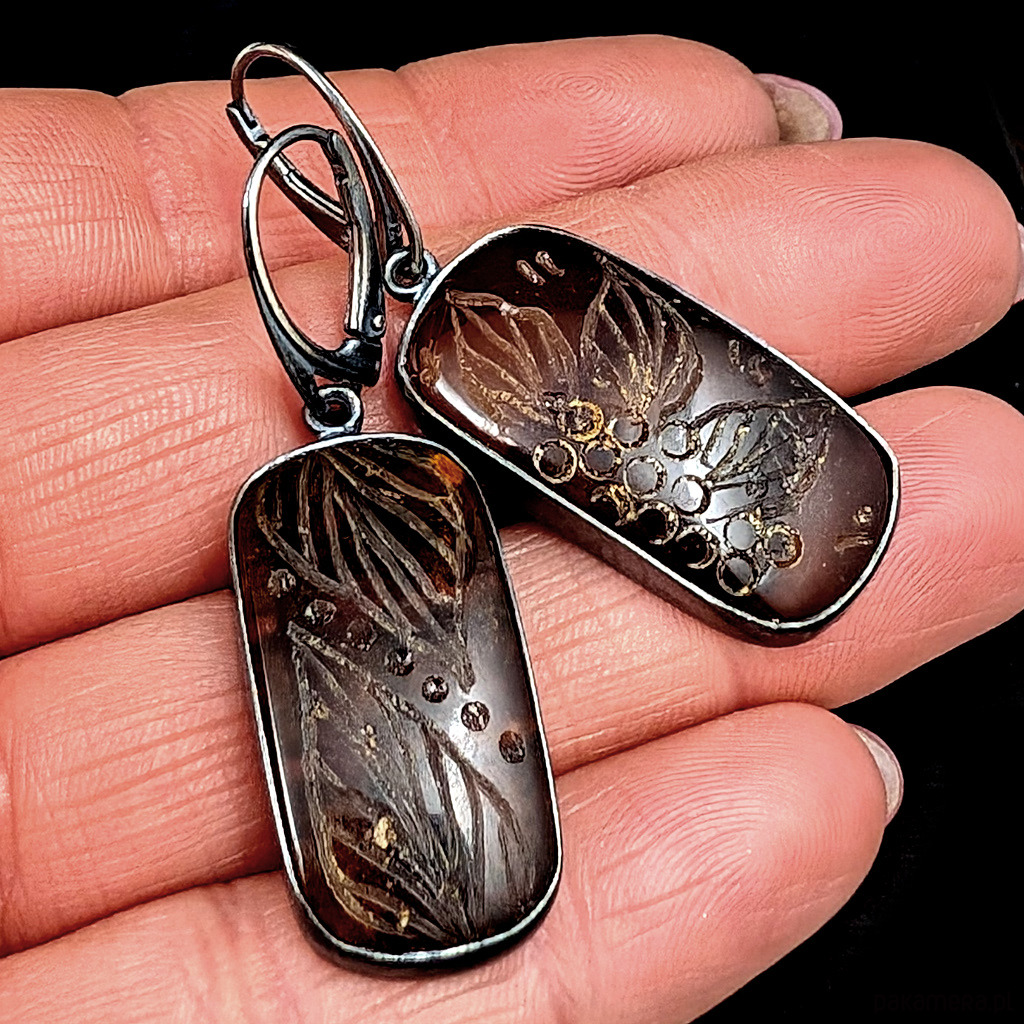 Romantyczne kolczyki z oprawionymi w oksydowane srebro pr.925 bursztynam w pięknej formie. Na tafli kamieni wyrzeźbione zostały kwiaty. Oprawa ma wymiary 30 x 15 mm. Długość kolczyków z biglami 50 mm. Waga jednego kolczyka 4,7 g. Kolczyki wysłane będą w ozdobnym pudełeczku.