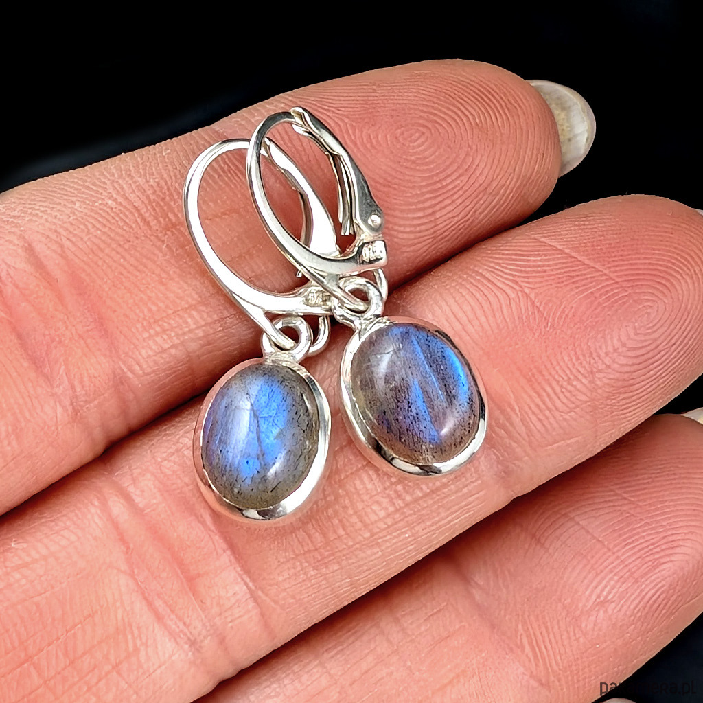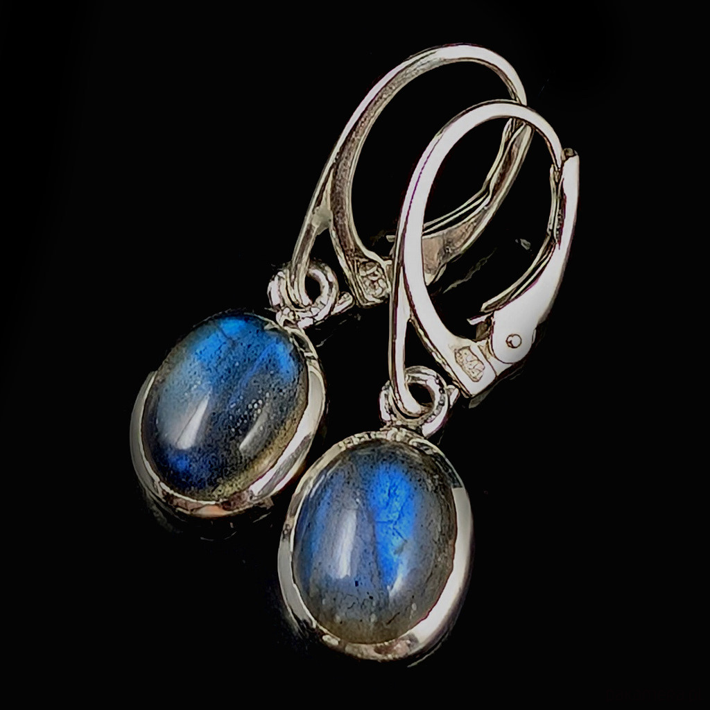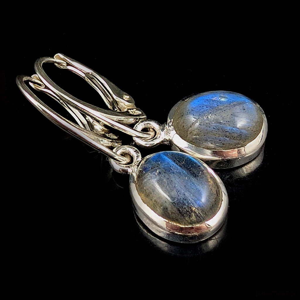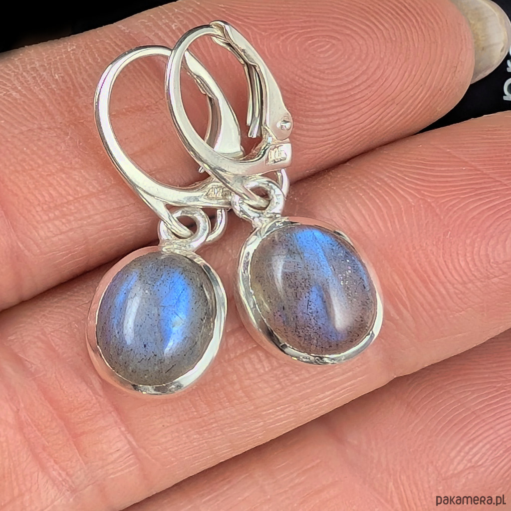 Kolczyki wykonane ze srebra próby 925 oraz naturalnych labradorytów. Długość całkowita z biglami 30 mm. elementy mają 11 x 9 mm. Waga jednego kolczyka 2 g. Kolczyki wysyłane zostaną w ozdobnym pudełeczku.