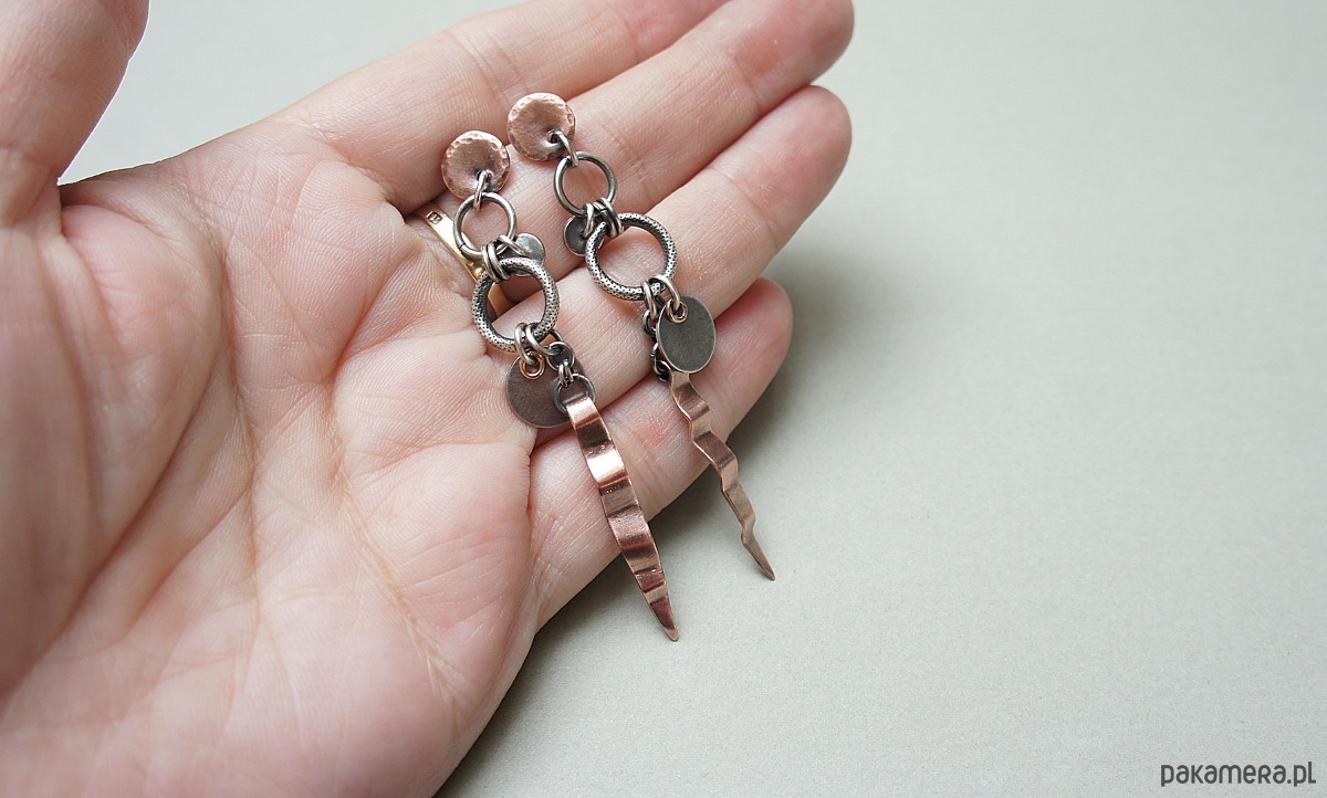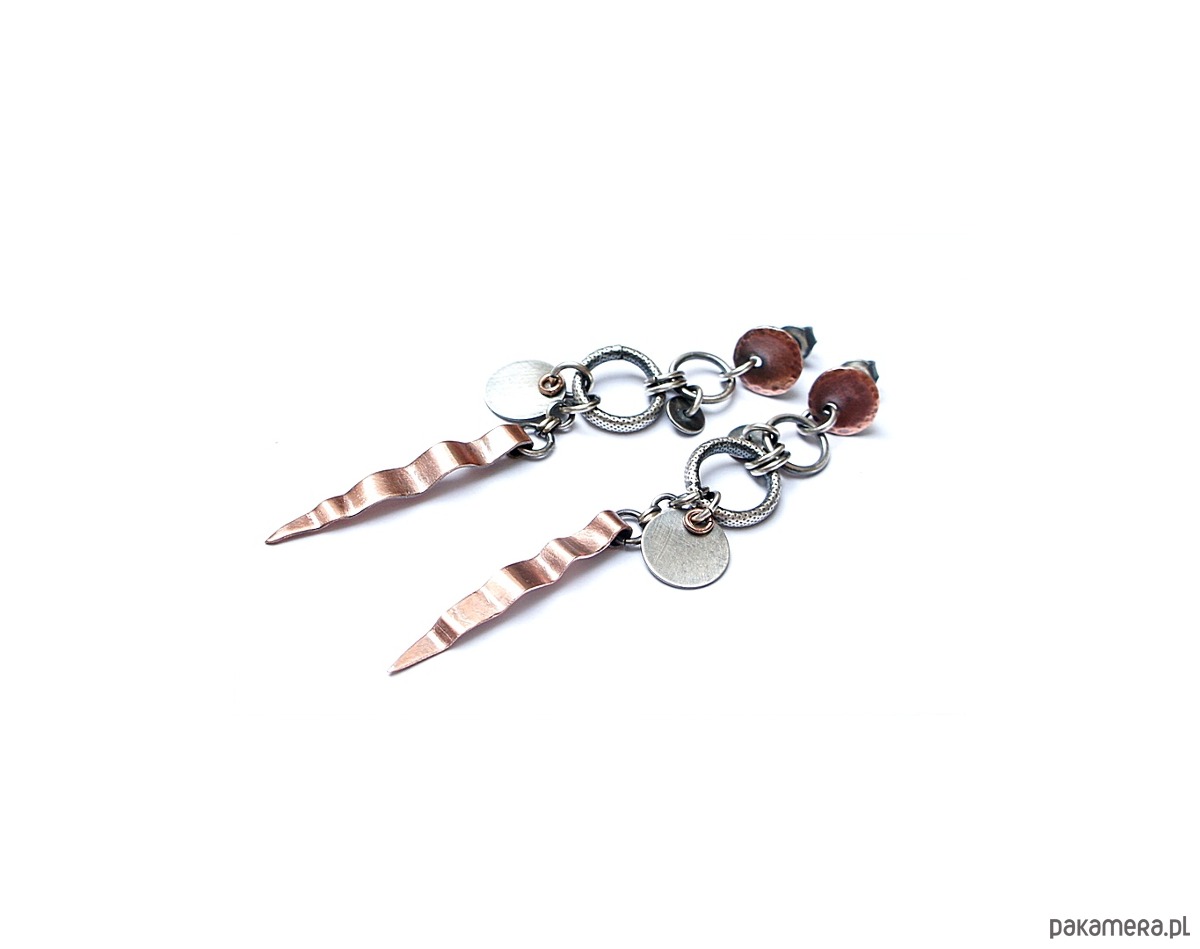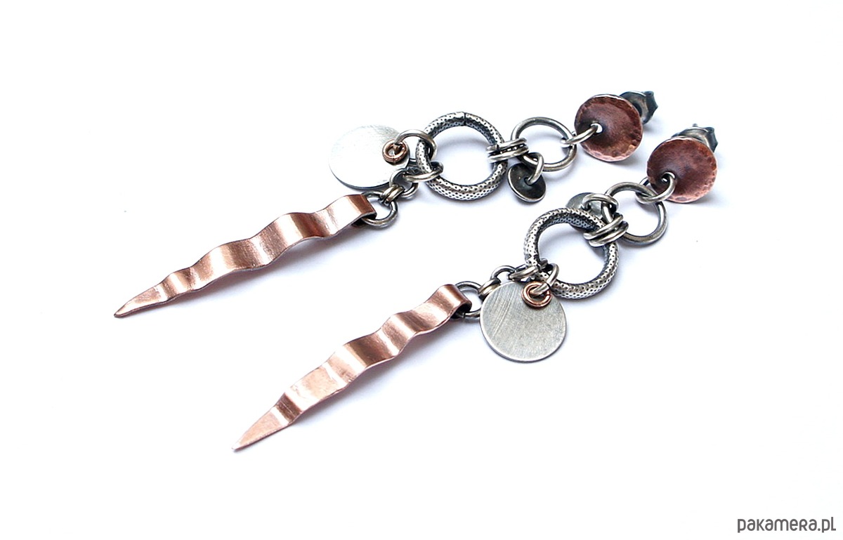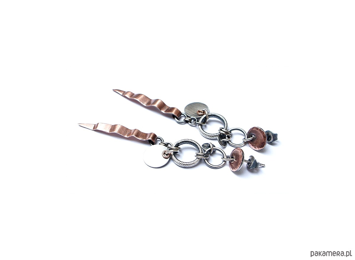 Kolczyki wykonane ze srebra i srebrnych kółeczek złoconych różowym złotem [pr. 925], srebrnych blaszek oraz własnoręcznie wykonanych miedzianych elementów /sztyfty i blaszki/. Całkowita długość kolczyków 7cm. Całość oksydowana i przetarta. Biżuteria ozdobnie zapakowana