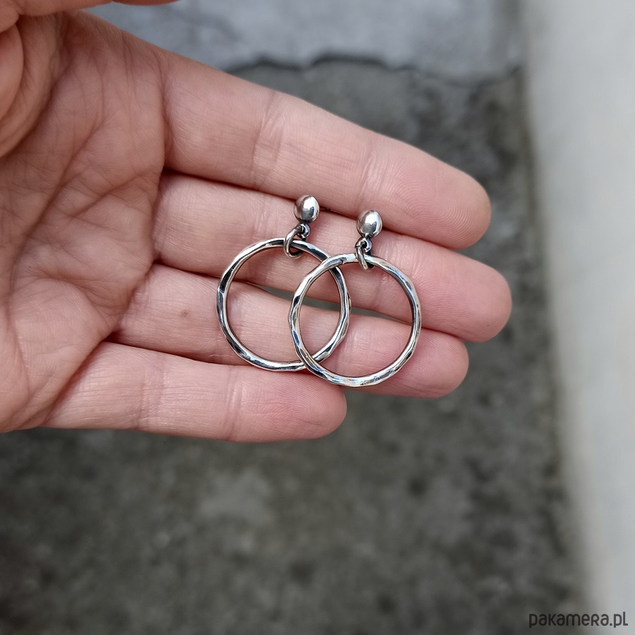 Połączenie klasyki i nowoczesności. Idealne codzienne kolczyki koła wykonane ze srebra pr 925, w tym ręcznie kutych, młotkowanych kół o średnicy ok. 2,5 cm. Długość całkowita, mierzona od szczytu sztyftów, wynosi 3,3 cm. Dodatkową zaletą moich kółek jest ich lekkość. Waga jednego kolczyka- 1,7 grama. Całość oksydowana i polerowana dla ładnego kontrastu. Proszę o kontakt przed zakupem jeśli chcieliby Państwo zamienić bigle na kajdanki lub angielskie- zmienia się wtedy cena.