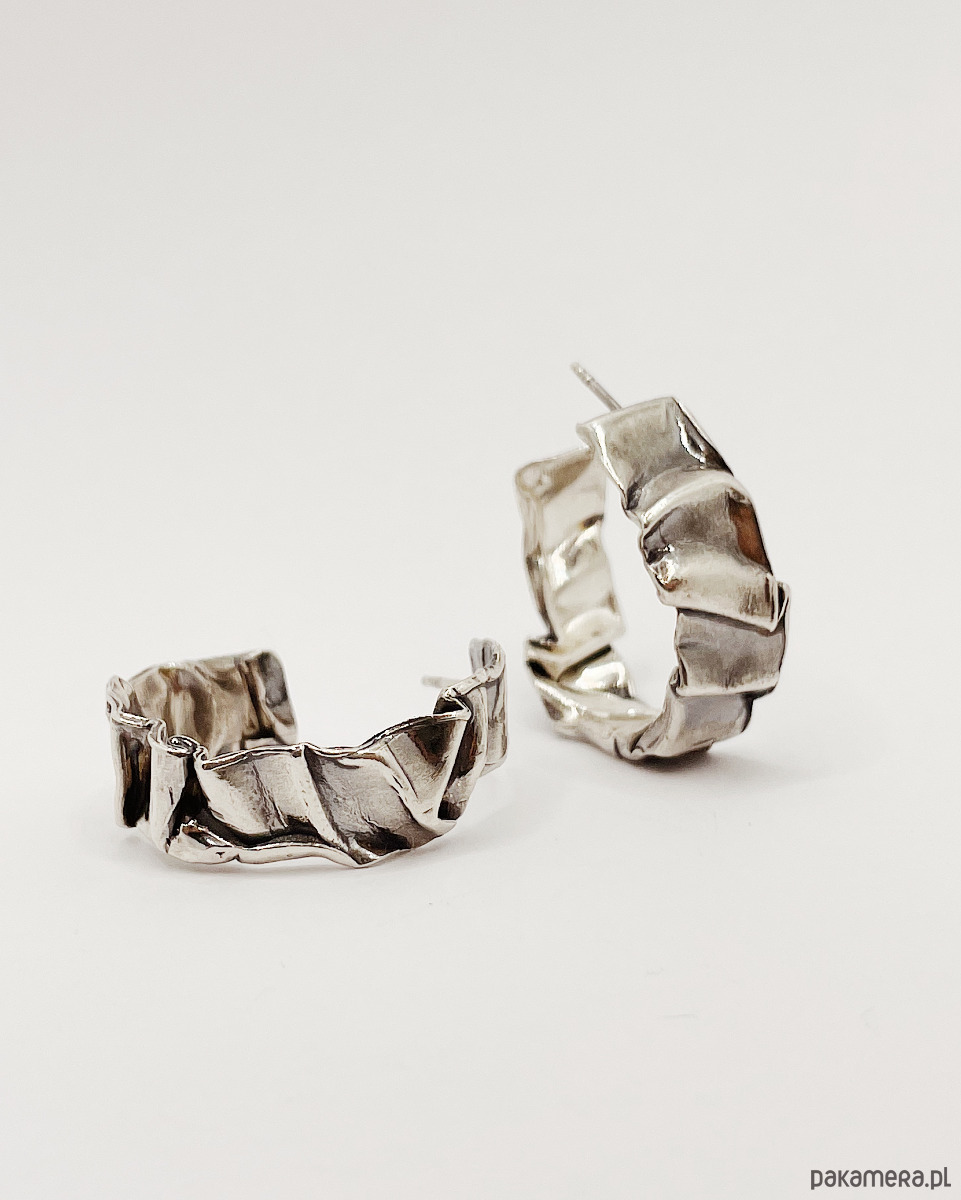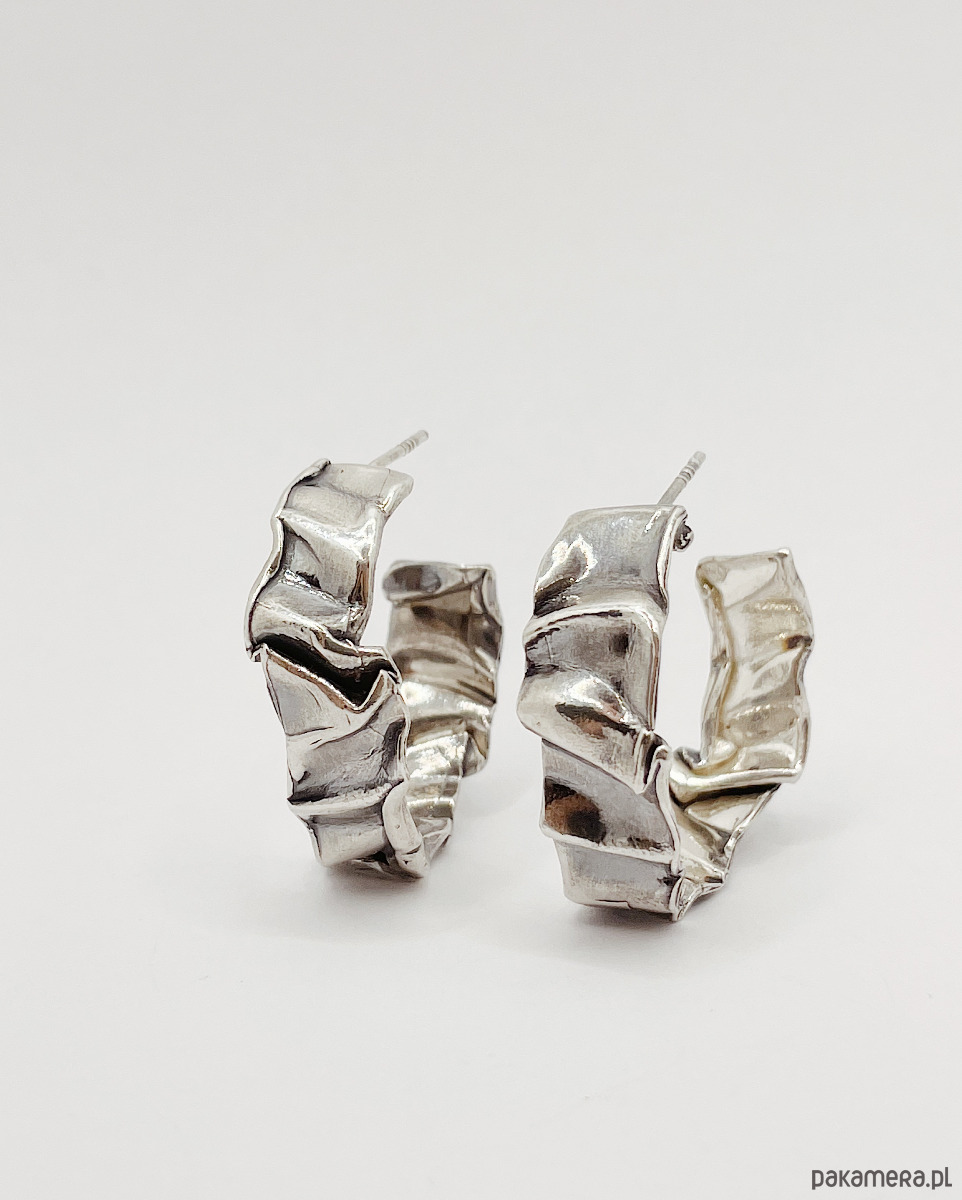 Kolczyki Fuko to nieregularne, masywne, otwarte koła o falowanej fakturze.