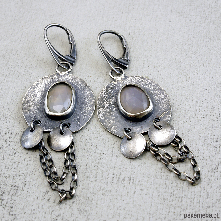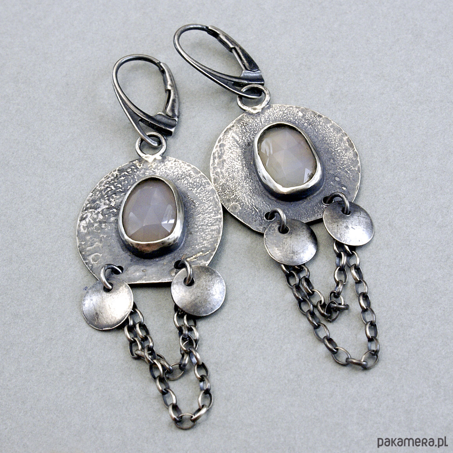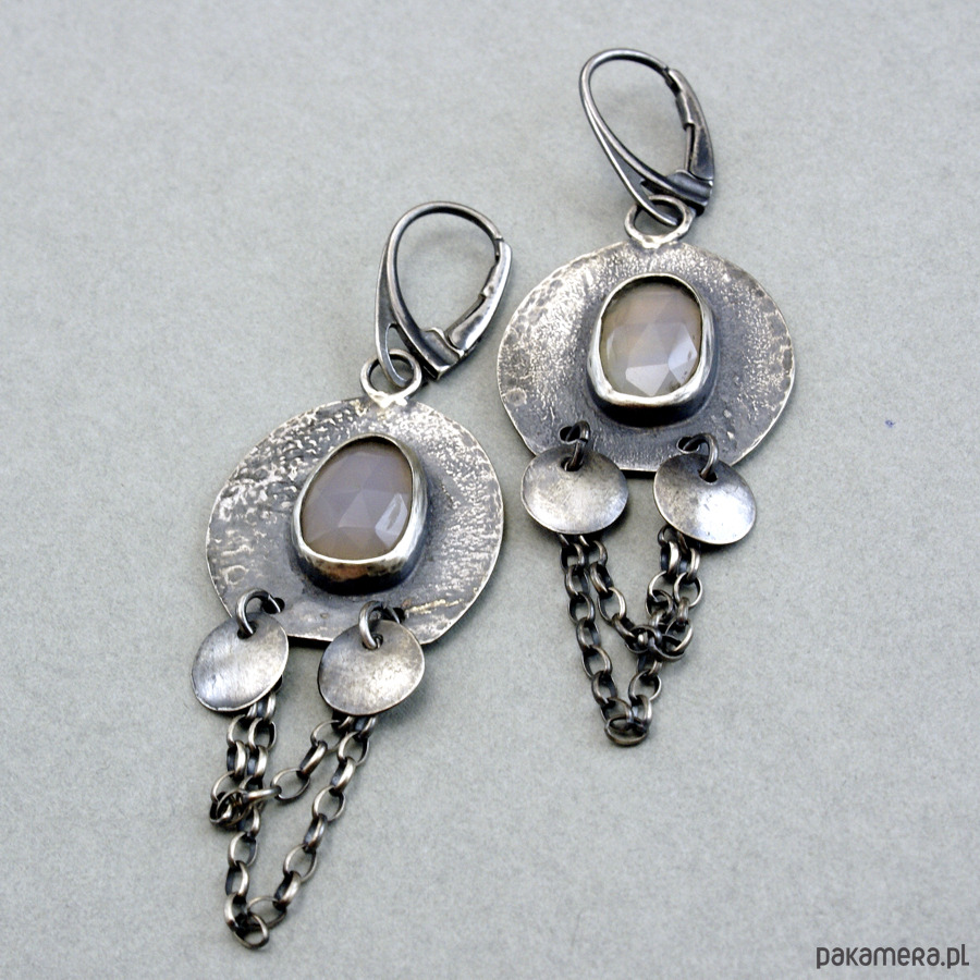 Kolczyki są wykonane ze fakturowanego srebra 925 i owalnych kaboszonów fasetowanego chalcedonu, wielkość kakamienia ok. 1,3x1,0 cm. Całkowita długość kolczyka z wiszącym łańcuszkiem to ok. 6,8 cm, długość bez bigla, głównego elementu z kółkami to ok. 3,5 cm a szerokość to ok. 2,3cm . Całość oksydowana, przecierana i lekko polerowana.