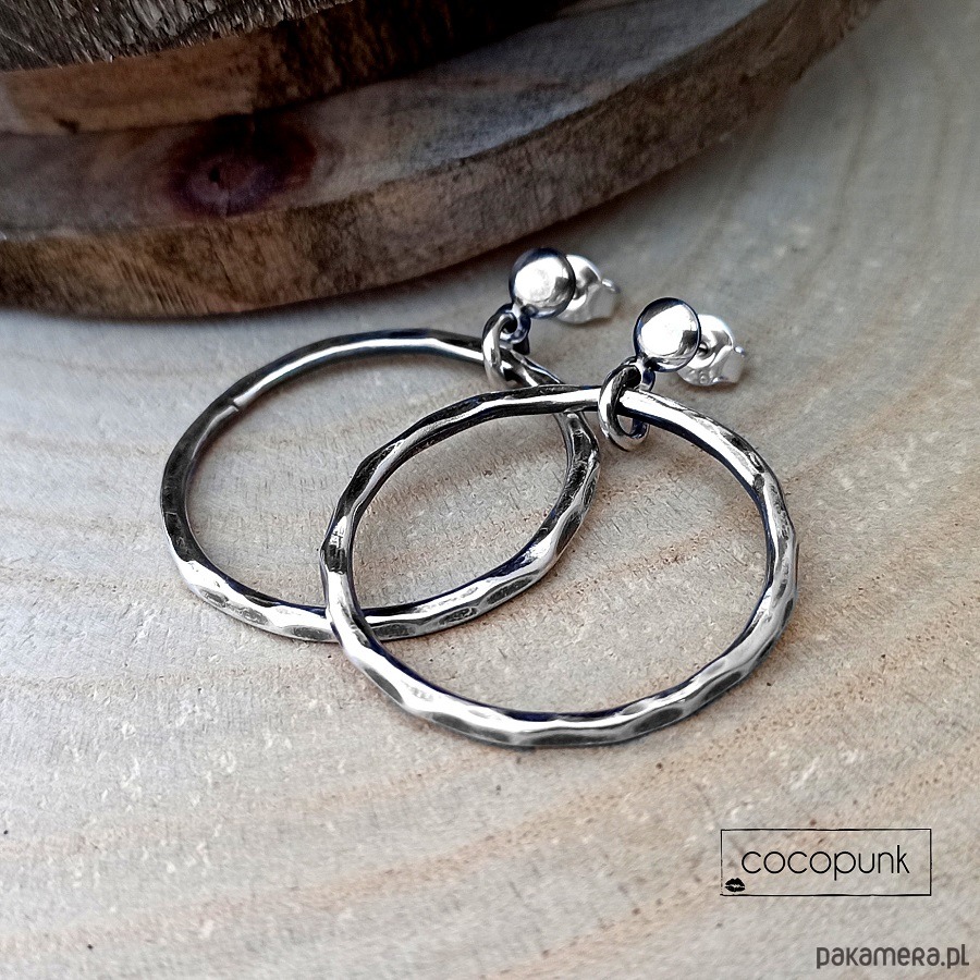 Połączenie klasyki i nowoczesności. Idealne codzienne kolczyki koła wykonane ze srebra pr 925, w tym ręcznie kutych, młotkowanych kół o średnicy ok. 2,5 cm. Długość całkowita, mierzona od szczytu sztyftów, wynosi 3,3 cm. Dodatkową zaletą moich kółek jest ich lekkość. Waga jednego kolczyka- 1,7 grama. Całość oksydowana i polerowana dla ładnego kontrastu. Proszę o kontakt przed zakupem jeśli chcieliby Państwo zamienić bigle na kajdanki lub angielskie- zmienia się wtedy cena.