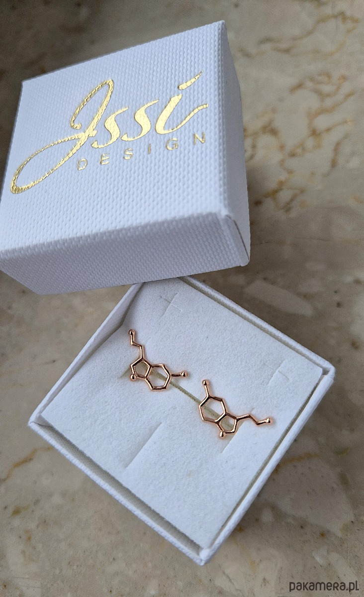 Kolczyki zapinane na sztyfty, w kształcie wzoru molekularnego serotoniny.