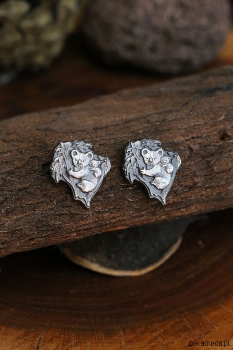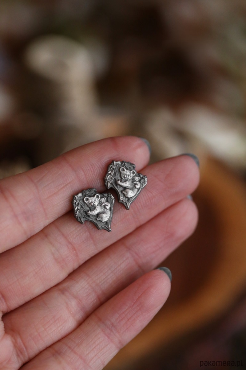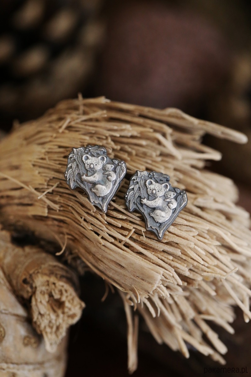 Urokliwe koale na tle gałęzi eukaliptusa są jednymi z fantastycznych zwierzaków spod znaku marki Cztery Humory. Kolczyki powstały według autorskiego projektu widocznego na jednym ze zdjęć. Srebro pokryto oksydą, nadającą mu stalowo - szary odcień i przetarto dla wydobycia szczegółów zwierzaka.