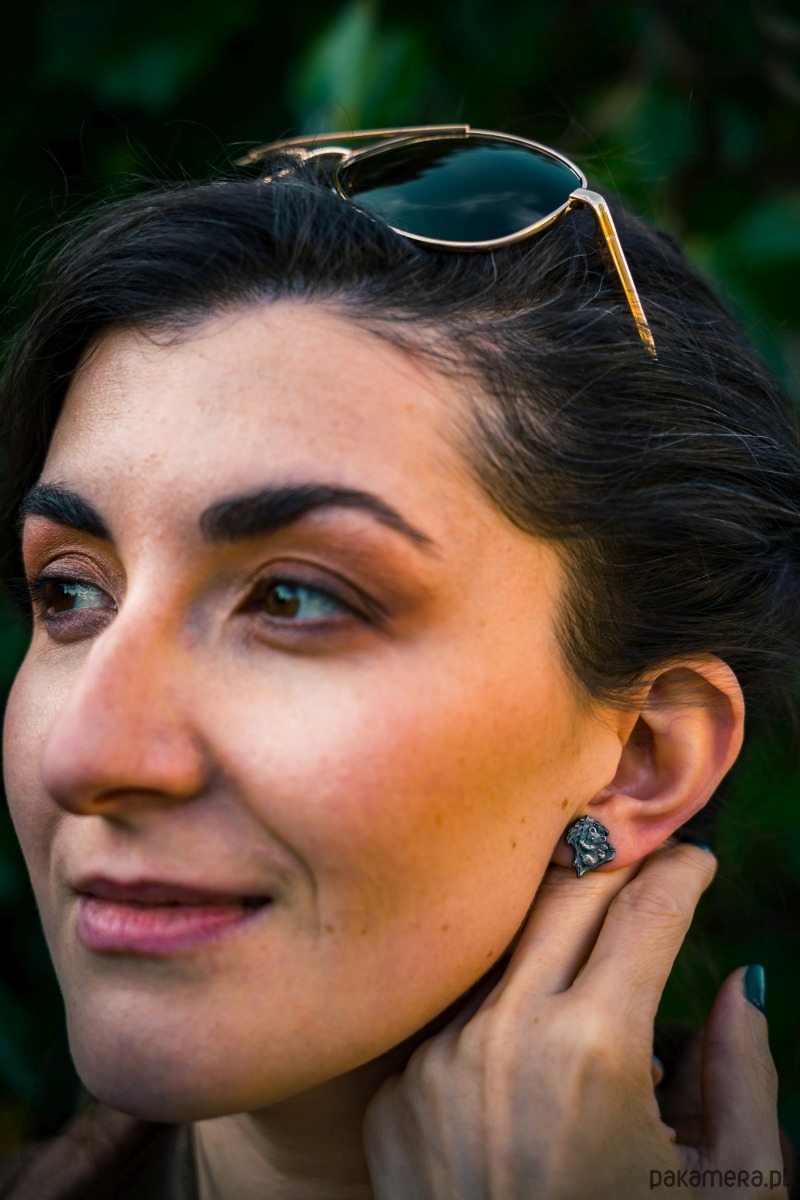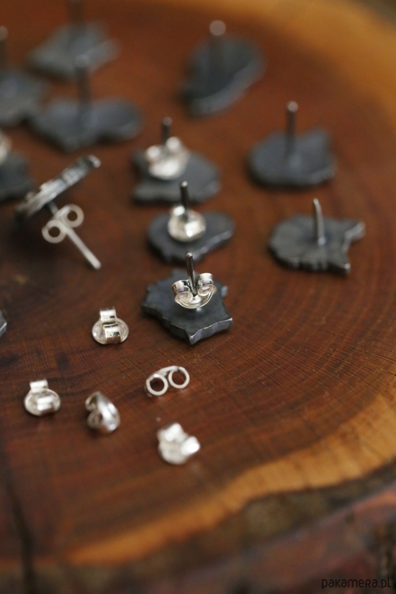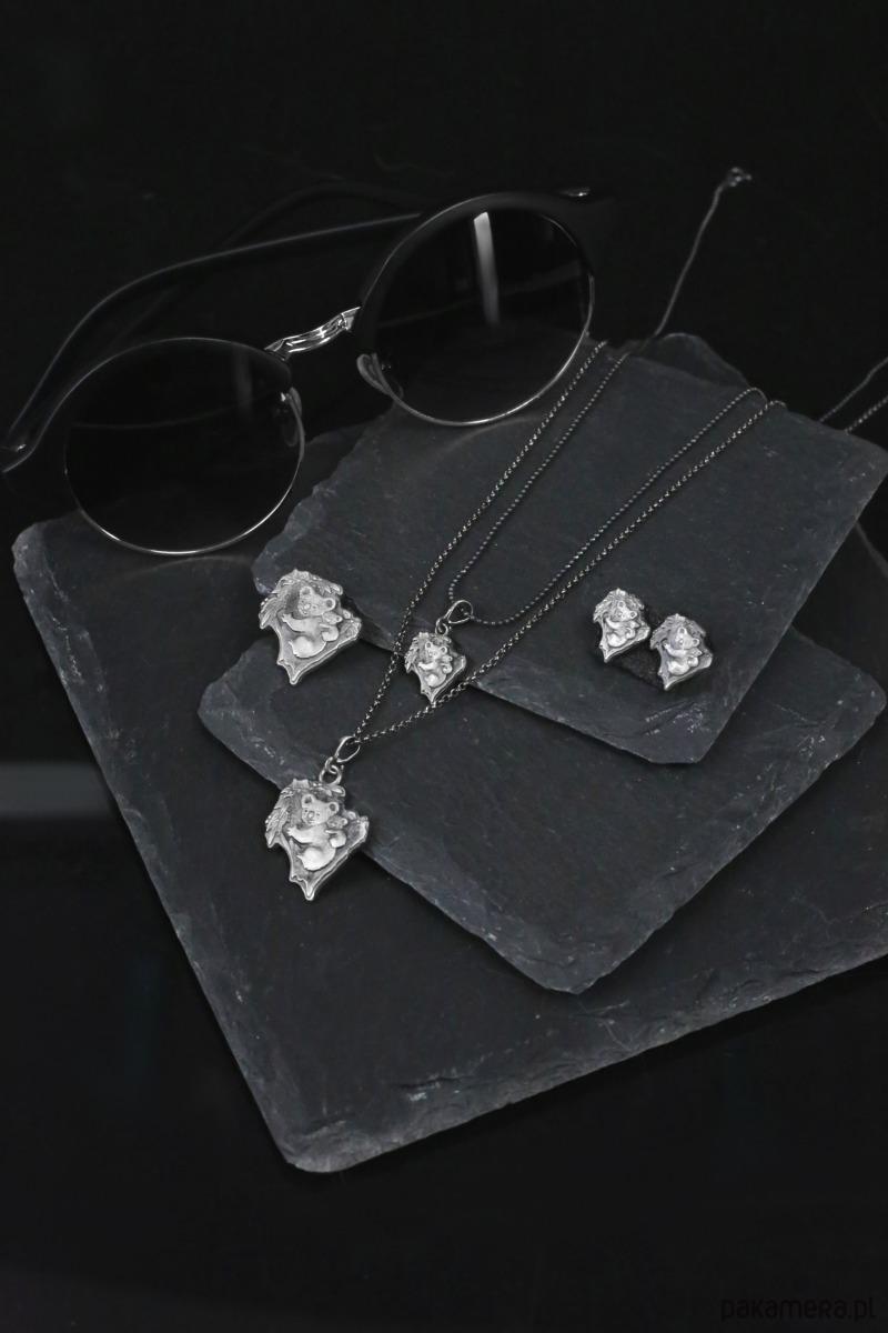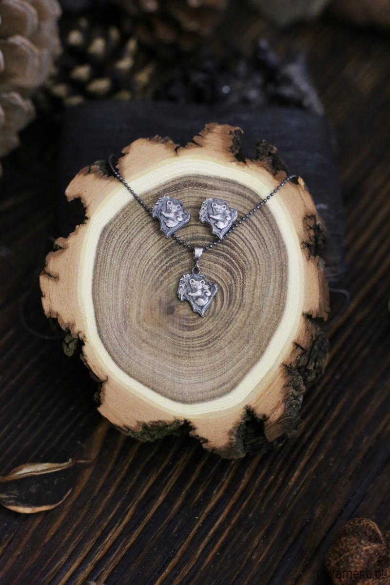 Urokliwe koale na tle gałęzi eukaliptusa są jednymi z fantastycznych zwierzaków spod znaku marki Cztery Humory. Kolczyki powstały według autorskiego projektu widocznego na jednym ze zdjęć. Srebro pokryto oksydą, nadającą mu stalowo - szary odcień i przetarto dla wydobycia szczegółów zwierzaka.