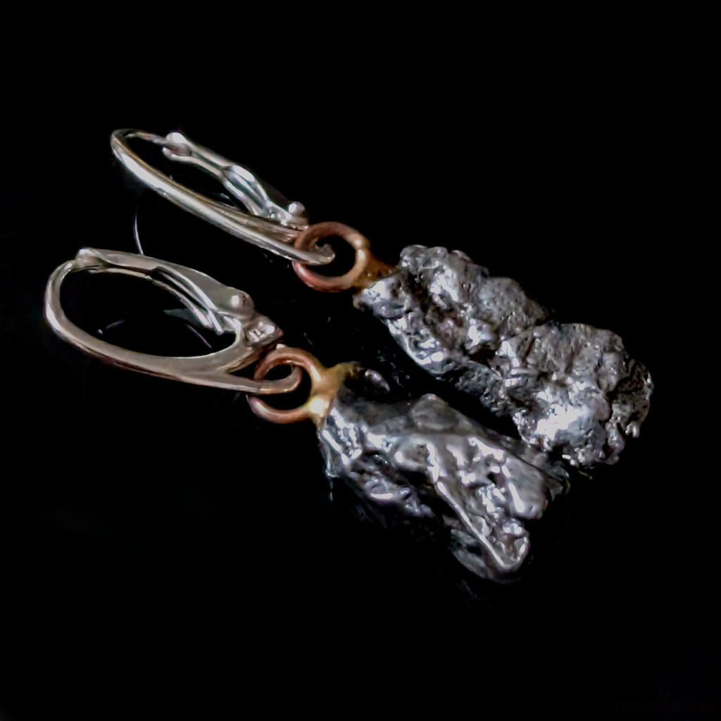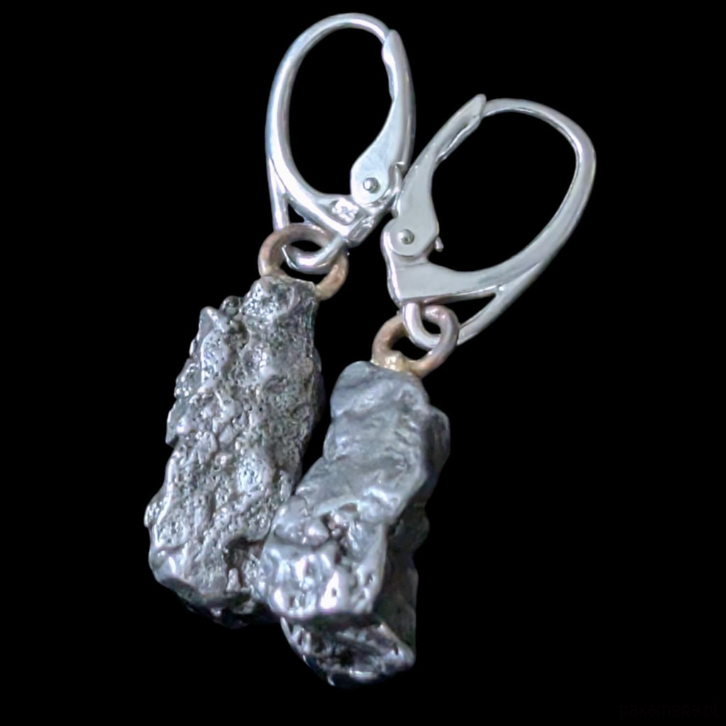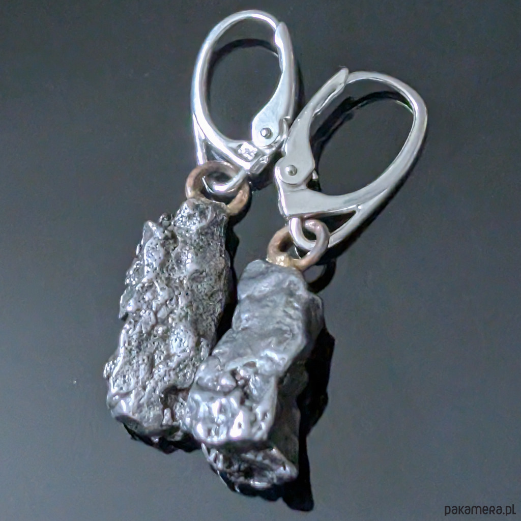 Kosmiczne kolczyki z meteorytami Campo Del Cielo (Argentyna) o kształcie nieregularnych bryłek na biglach angielskich ze srebra próby 925. Wymiary elementów 19 x 7 mm. Długość z biglami angielskimi 36 mm. Lekkie, komfortowe i bardzo efektowne. Waga jednego kolczyka 3,38 grama. Kolczyki zostaną wysłane w ozdobnym pudełeczku.