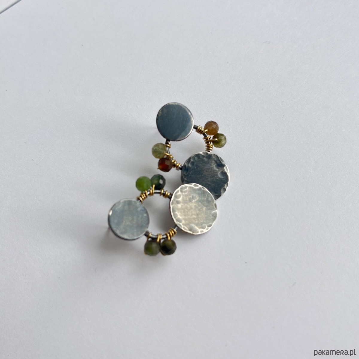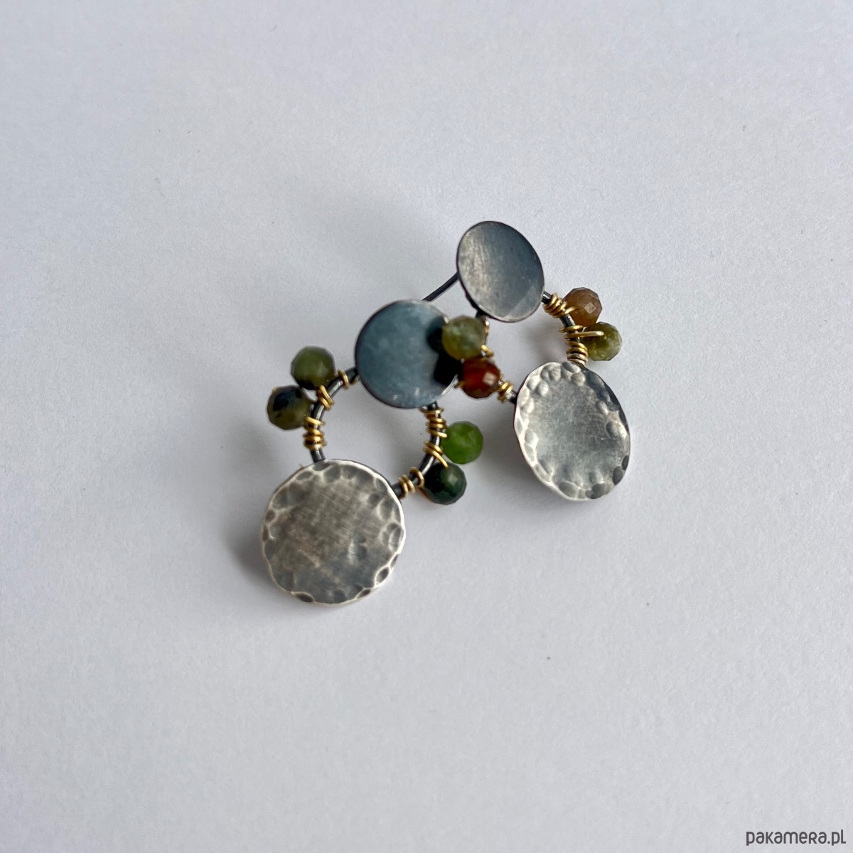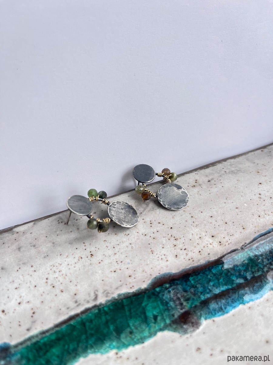 Autorskie srebrne kolczyki wykonane od podstaw ręcznie. Kompozycja z oksydowanego srebra, turmalinów i złoconego akcentu.