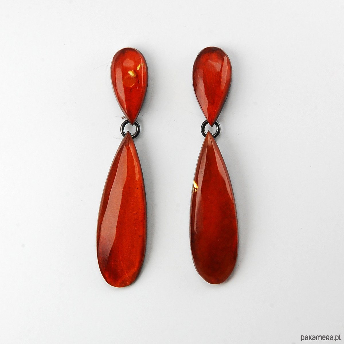 Srebrne kolczyki krople z naturalnym wiśniowym bursztynem bałtyckim.