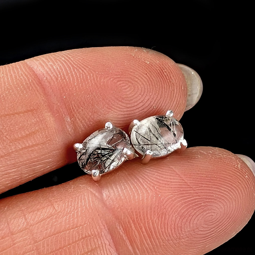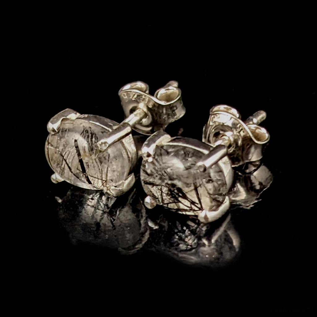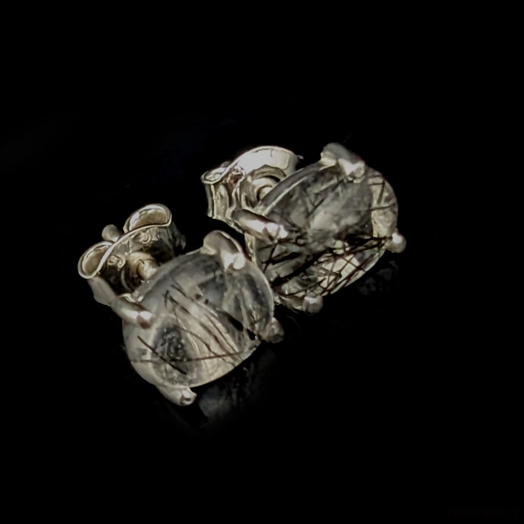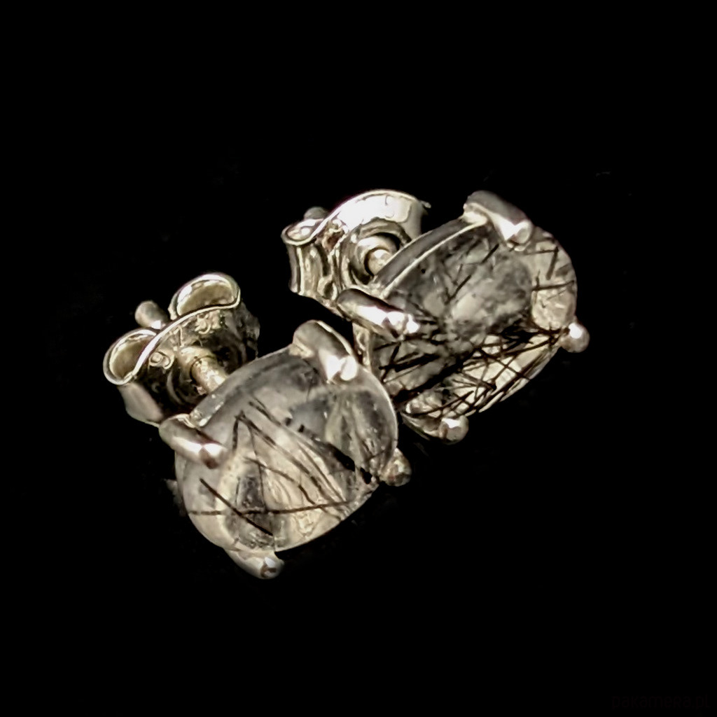 Kolczyki sztyfty z ciekawym kwarcem z inkluzjami czarnego turmalinu. Wymiary 8 x 6 mm, srebro 925, wykonane przez dostawcę kamieni.