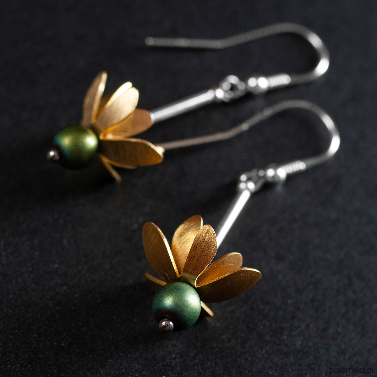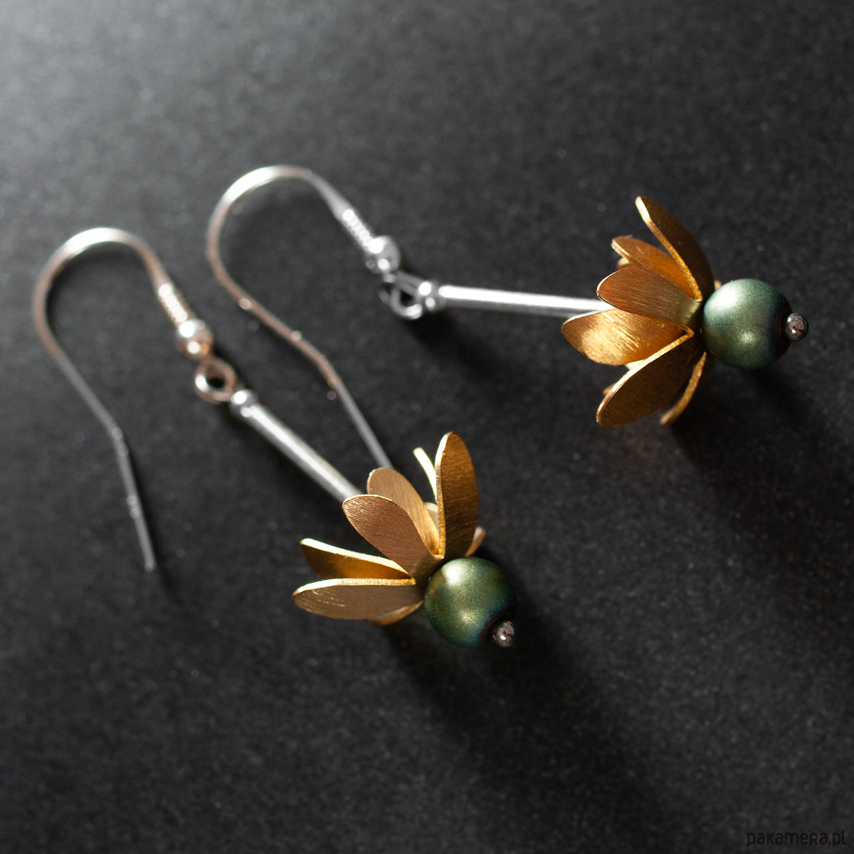 Czarujące kolczyki - kwiatki z kolekcji PRZEDWIOŚNIE. Delikatne płatki z mosiądzu wieńczą efektowny koralik z hematytu. Jego barwa jest wyjątkowa i interesująca, zielono - niebieska, mataliczna. Kolczyki, dzięki ruchomemu połączeniu z biglem są w ciągłym ruchu. Dodają odczucia radości i beztroski podczas ich noszenia. Długość kolczyków razem z biglem - 5 cm. Średnica kwiatka ~ 1,5 cm. Długość elementu dekoracyjnego - kwiatka ~ 3 cm. Wykorzystany metal to srebro 925 (40%), mosiądz (58%) i stal chirurgiczna (2%). Biżuterię w wykonujemy ręcznie, według własnego projektu w pracowni Anillo. Kolczyki starannie zapakujemy i prześlemy w eleganckim kartoniku.