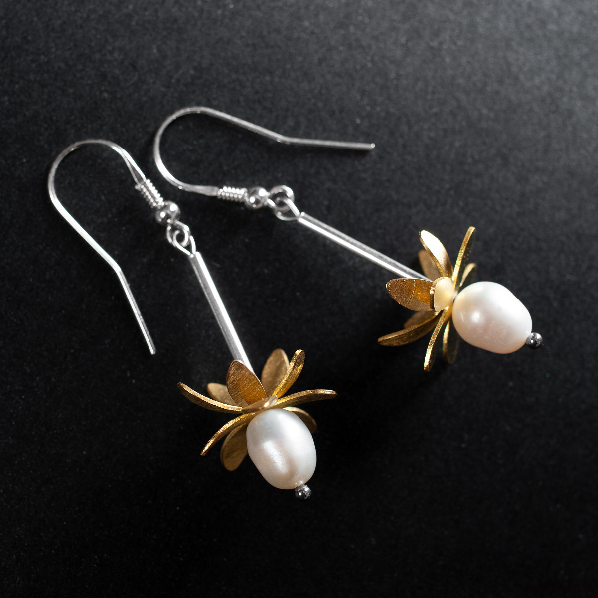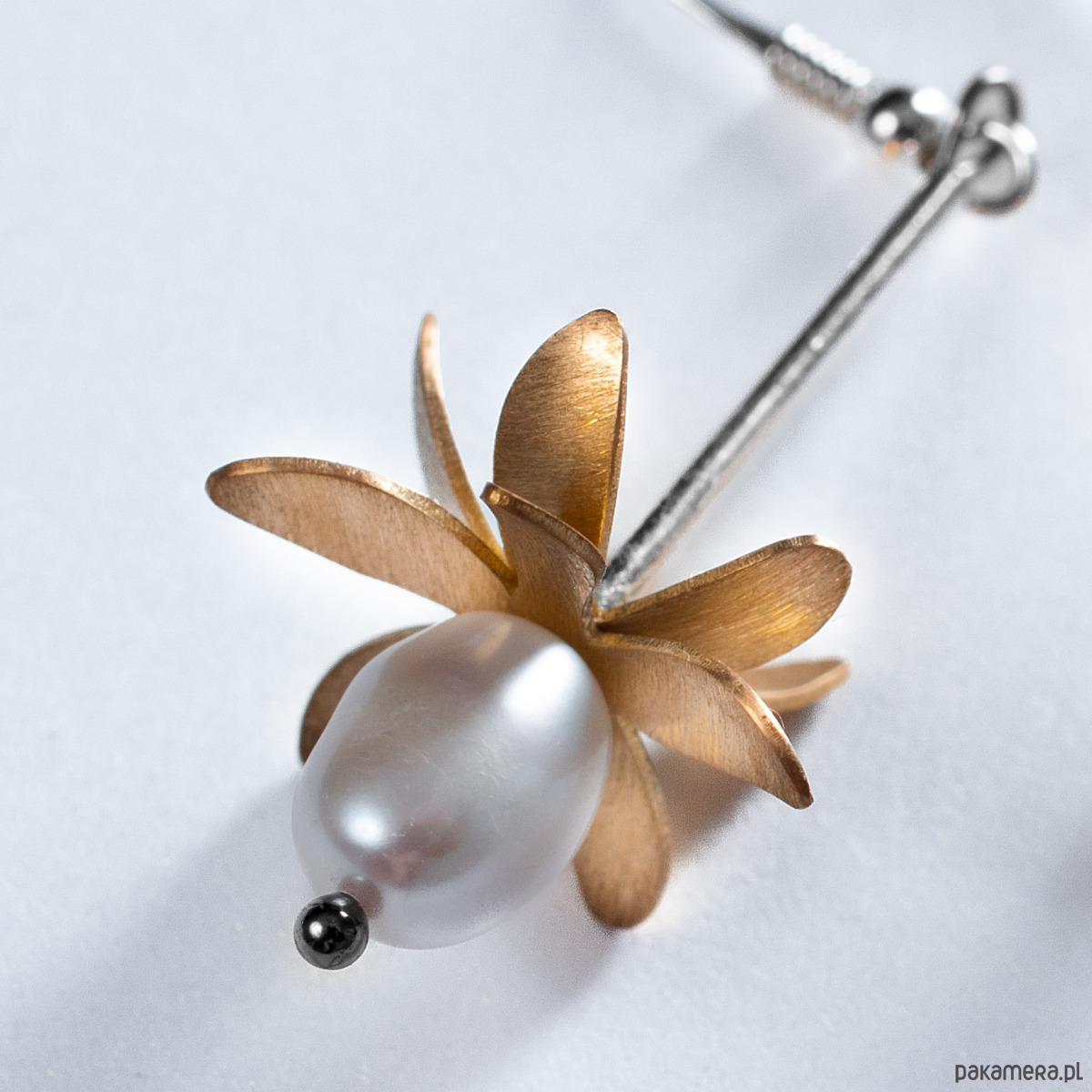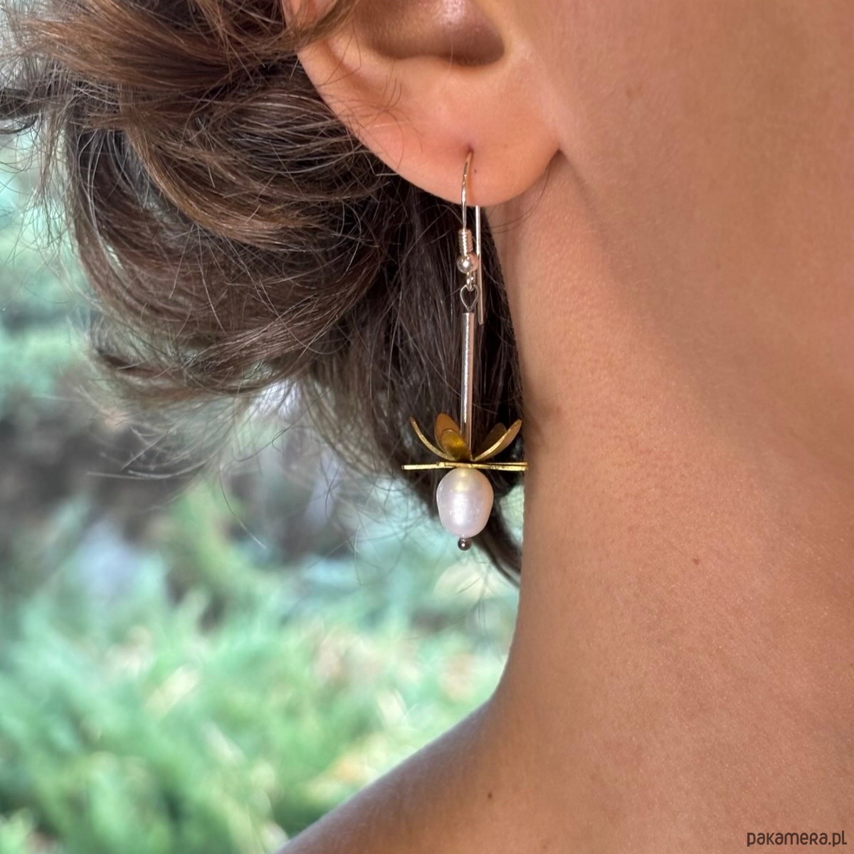 Śliczne kolczyki - kwiatki z kolekcji PRZEDWIOŚNIE. Delikatne płatki z mosiądzu otaczające piękną białą perłę połączone są z biglem poprzez cienką, srebrną rureczkę, zakończoną pozłacaną srebrną kuleczką. Sposób mocowania sprawia, że podczas ruchu kolczyki kołyszą się figlarnie przy twarzy. Wprawiają w dobry nastrój Panie, które je noszą. Długość kolczyków razem z biglem - 5 cm. Średnica kwiatka ~ 2 cm. Długość elementu dekoracyjnego - kwiatka ~ 3,5 cm. Wykorzystany metal to srebro 925 (40%), mosiądz (58%) i stal chirurgiczna (2%). Biżuterię w wykonujemy ręcznie, według własnego projektu w pracowni Anillo. Kolczyki starannie zapakujemy i prześlemy w eleganckim kartoniku.