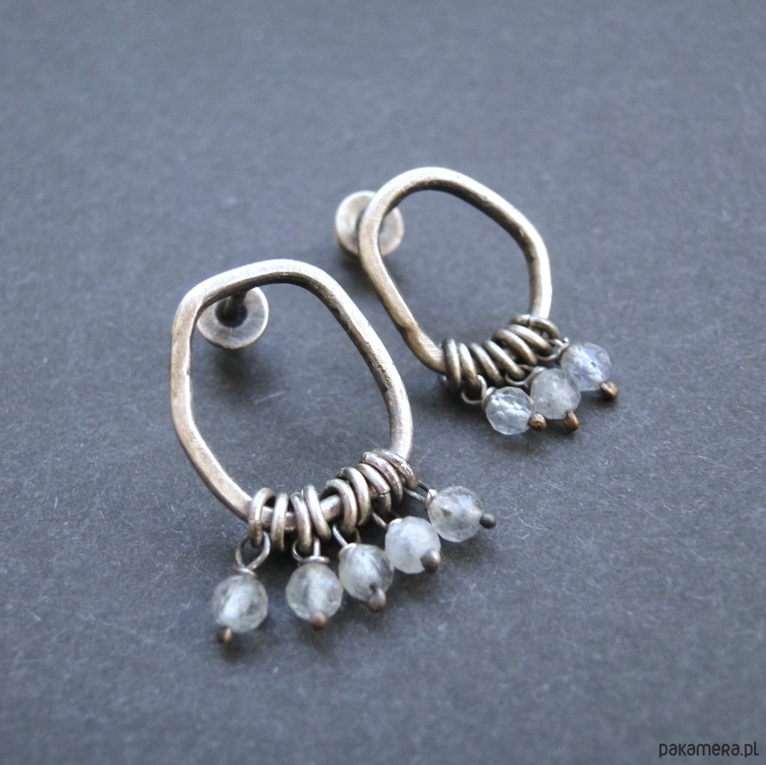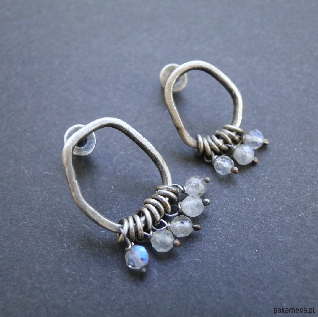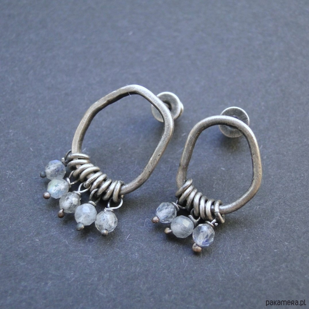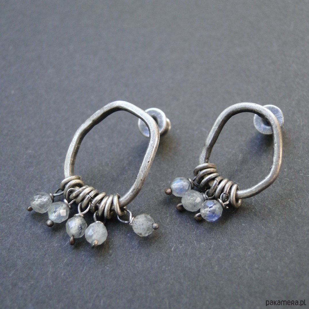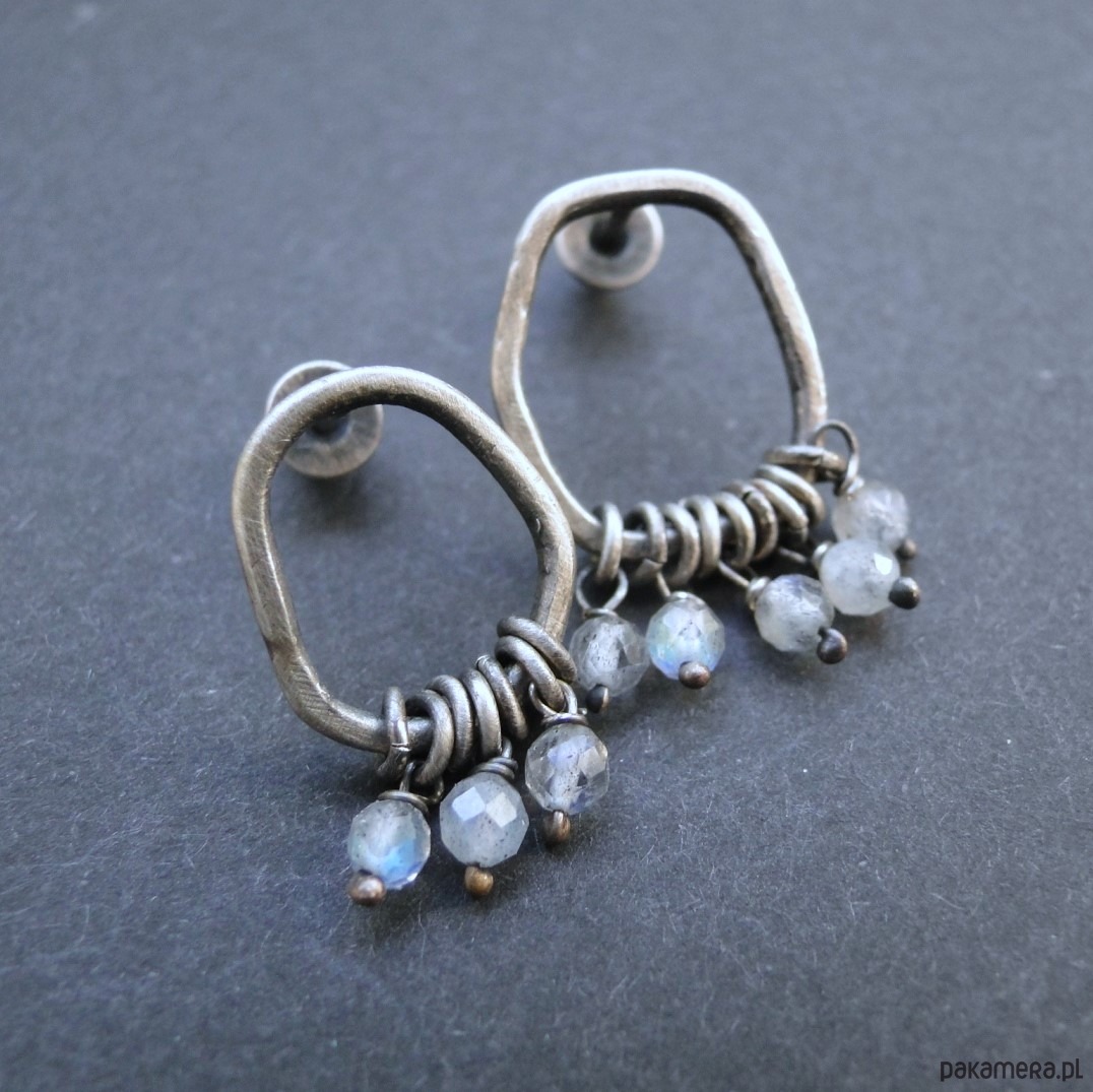 Surowe kolczyki w najmodniejszym kształcie. Srebro 925,oksydowane i szorowane. Kamienie: labradoryt śr 3 mm z niebieską poświatą. Sztyfty nieregularne,ręcznie wykonane.Wielkość kolczyków: 2,5 oraz 2,2 cm. Nie moczyć w wodzie.