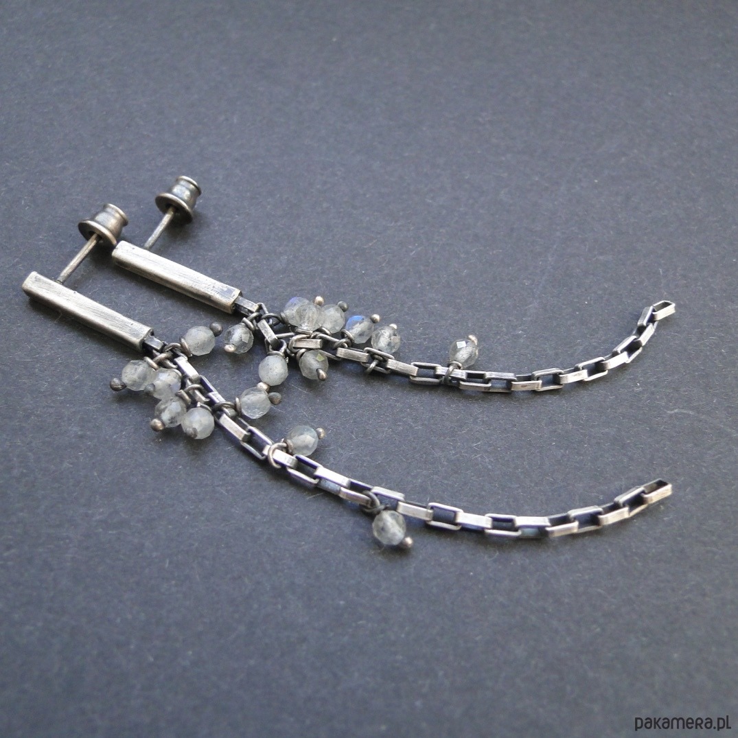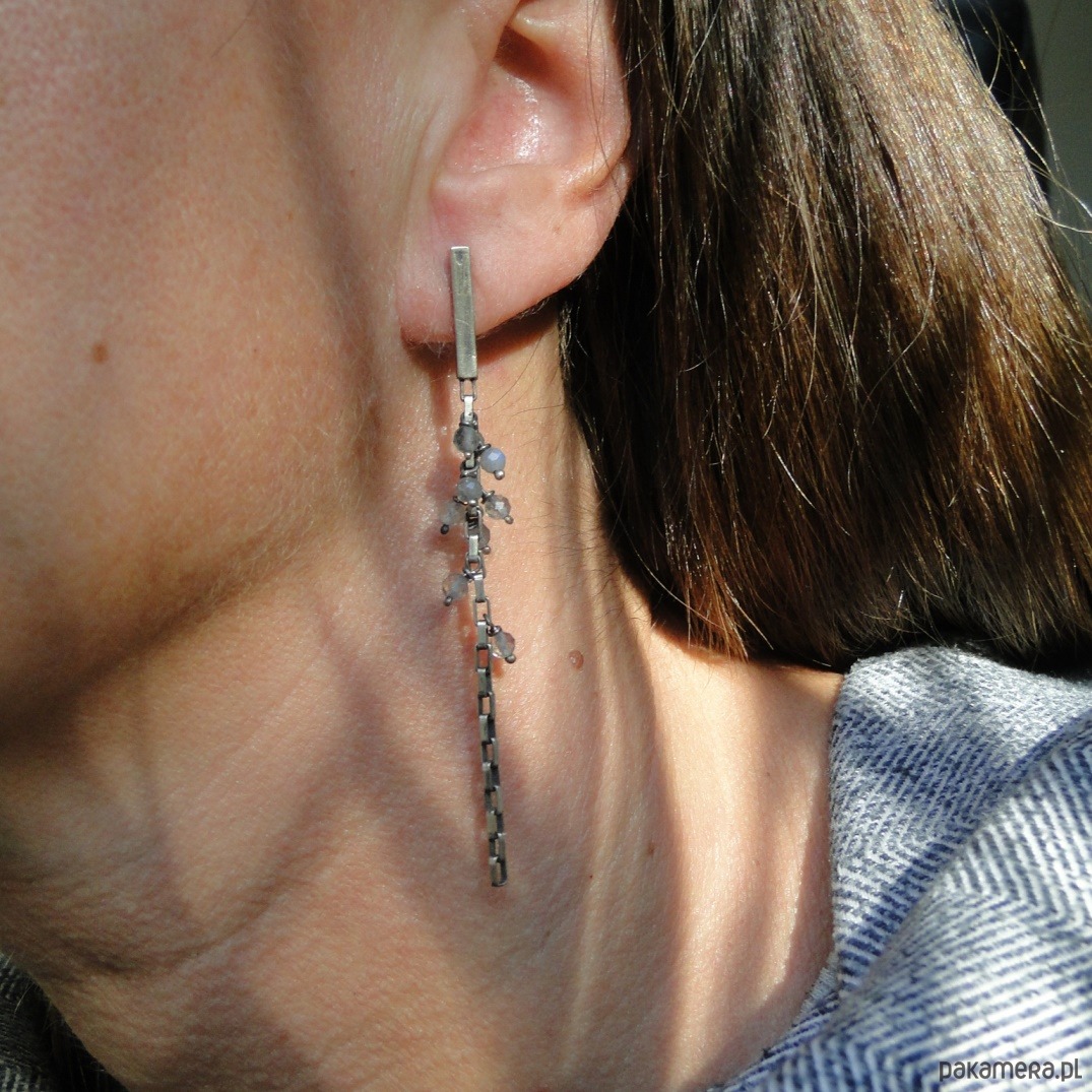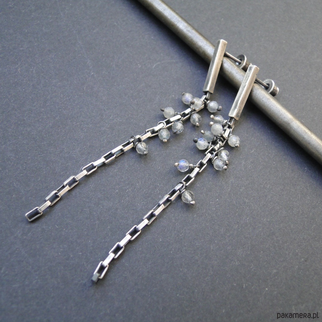 Długie,surowe kolczyki z kroplami labradorytu. Srebro 925,oksydowane i szorowane. Kamienie: labradoryt śr 3mm z niebieską poświatą. Zapięcia typu sztyft ręcznie wykonane w mojej pracowni. Długość kolczyka- 8cm. Nie moczyć w wodzie (oksyda wówczas szybciej się ściera).