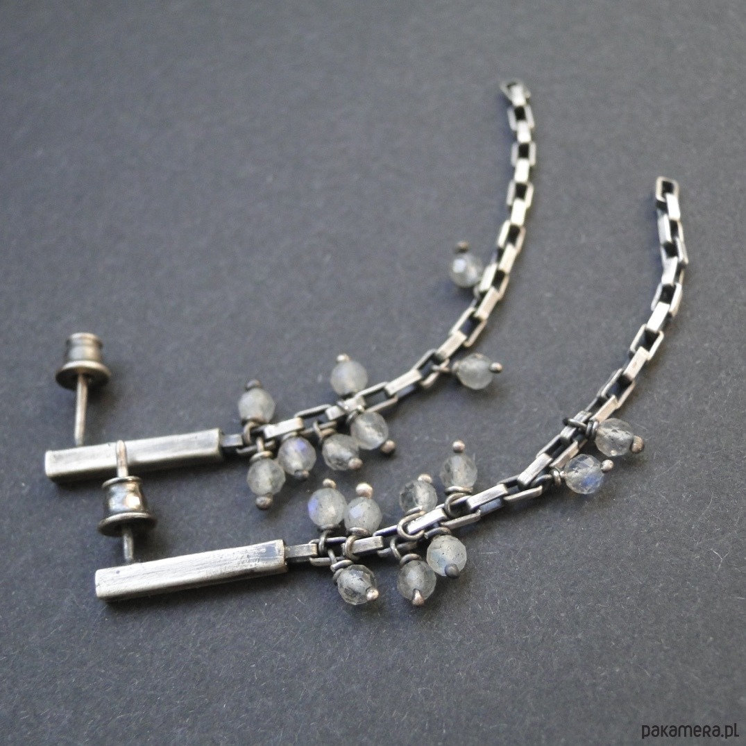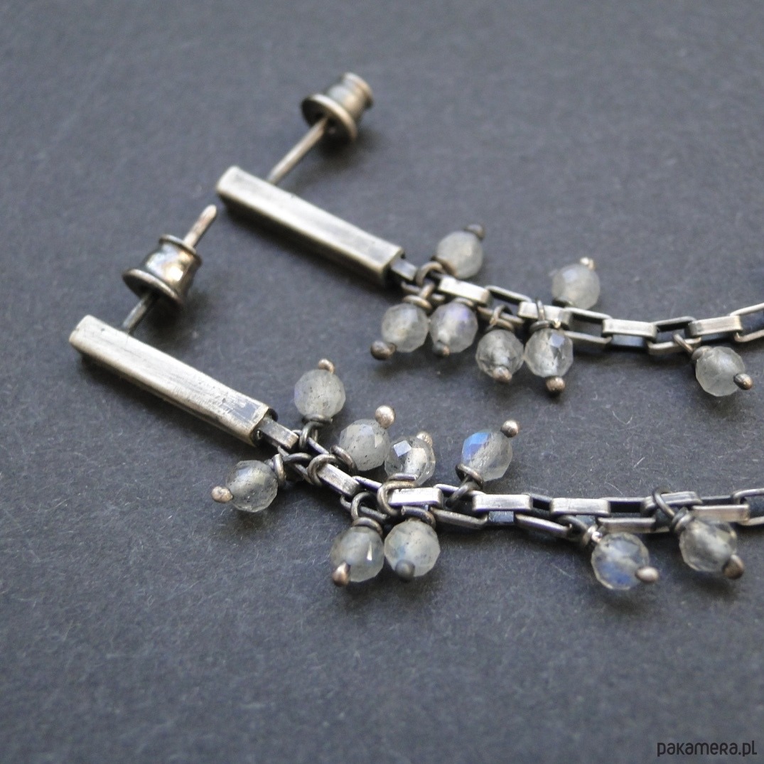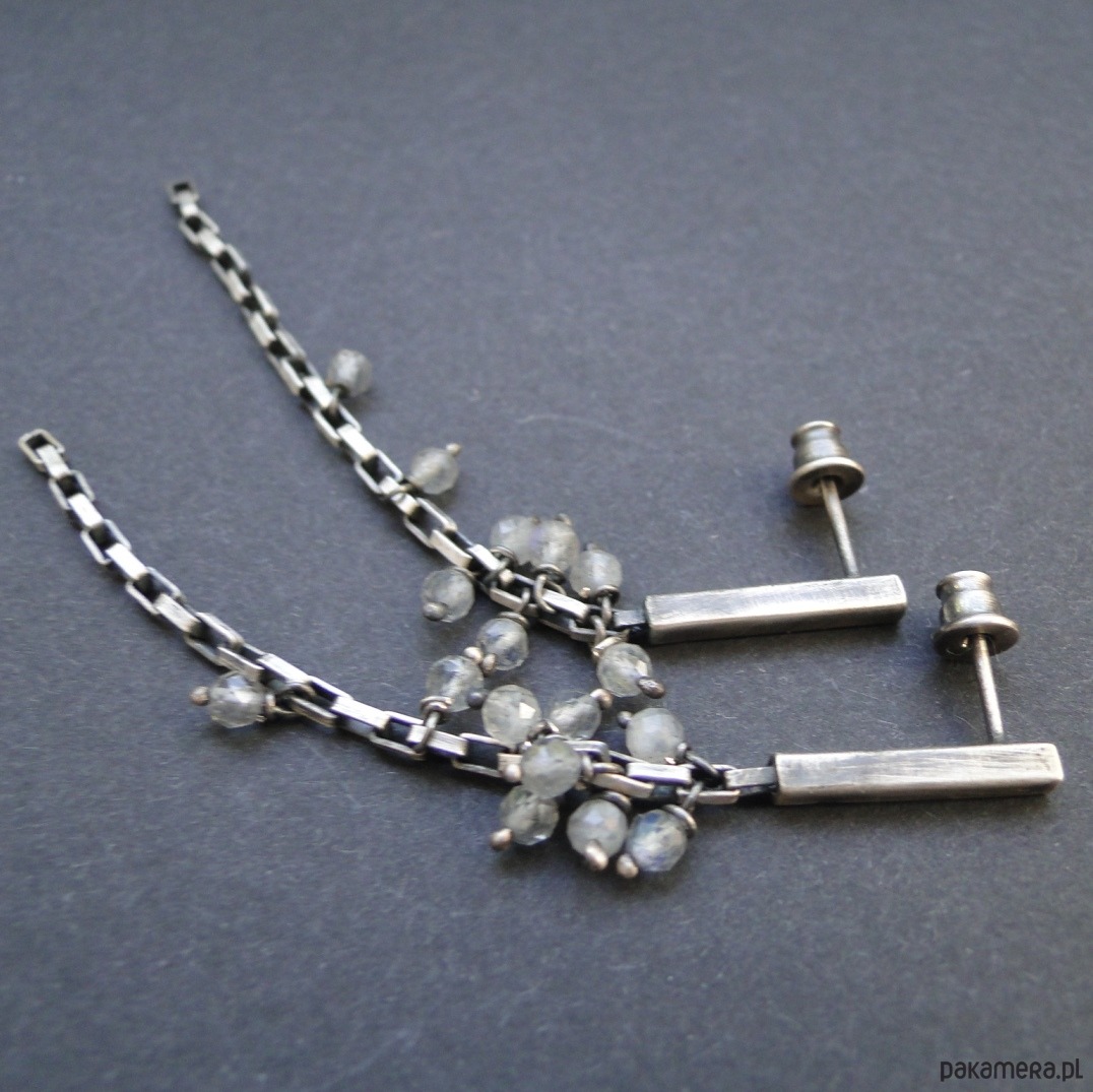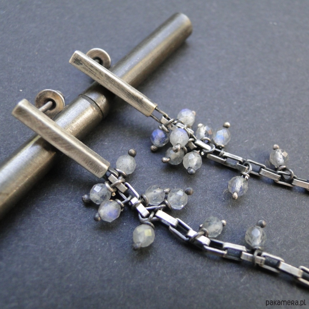 Długie,surowe kolczyki z kroplami labradorytu. Srebro 925,oksydowane i szorowane. Kamienie: labradoryt śr 3mm z niebieską poświatą. Zapięcia typu sztyft ręcznie wykonane w mojej pracowni. Długość kolczyka- 8cm. Nie moczyć w wodzie (oksyda wówczas szybciej się ściera).