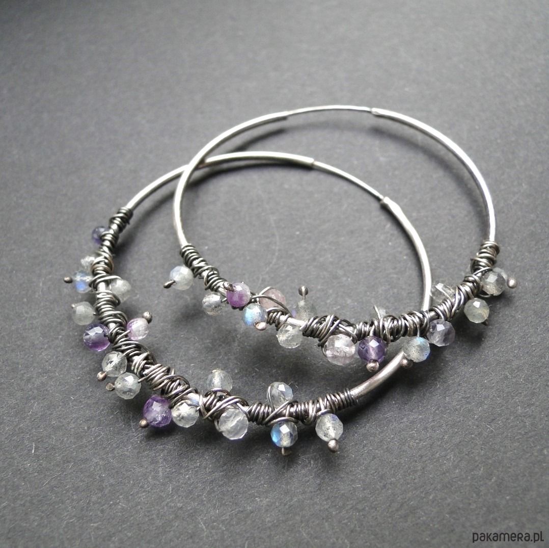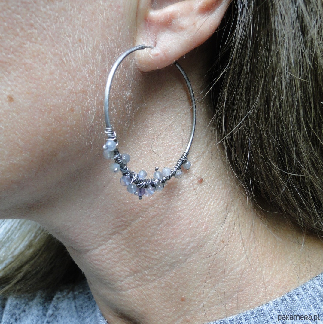 Surowe,oryginalne kolczyki typu koła.Wykonane ręcznie z ogromną dbałością o szczegół, zwłaszcza w doborze kolorystycznym kamieni. Srebro pr.925,oksydowane i szorowane. Kamienie: labradoryt z niebieską poświatą, fluoryt i agat. Średnica kół 4,5 cm. Kolczyki delikatne,przechowywać osobo.