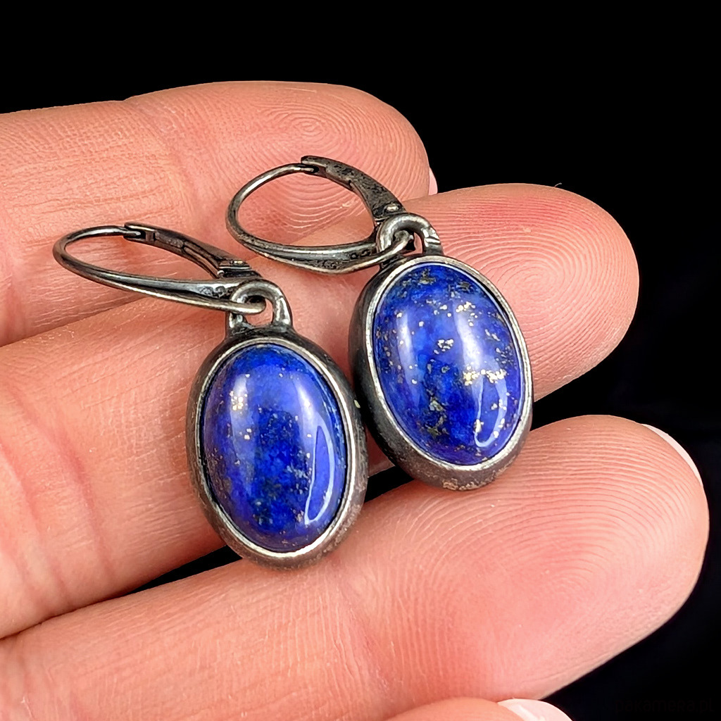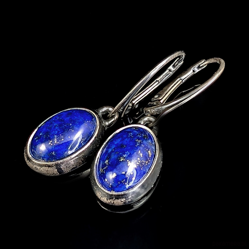 Lapis lazuli to piękna skała stworzona naturalnie z minerału azuryt z domieszkami licznych minerałów, z których najbardziej pożądany jest piryt. Od starożytności lapis lazuli zdobił biżuterię,a także wykorzystywany był jako materiał na przedmioty kultu, precjoza (np. maska grobowca Tutenchamona). Kolczyki z lapisem lazuli oprawionym w oksydowane srebro próby 925. Wymiary całej oprawy 15 x 11 mm. Długość z biglami 33 mm. Waga jednego 3,4 g. Zostaną zapakowane w ozdobne pudełeczko.