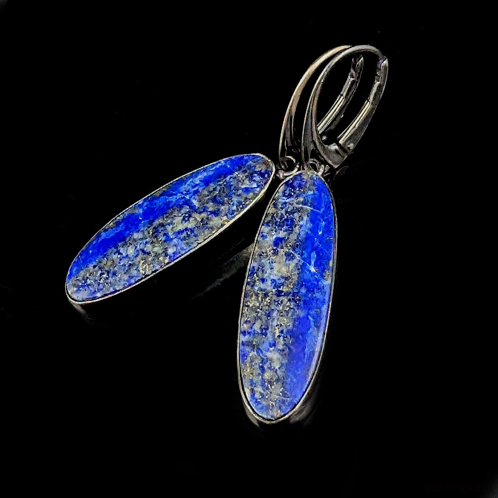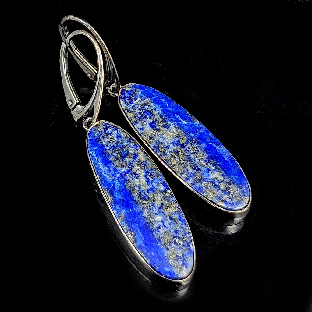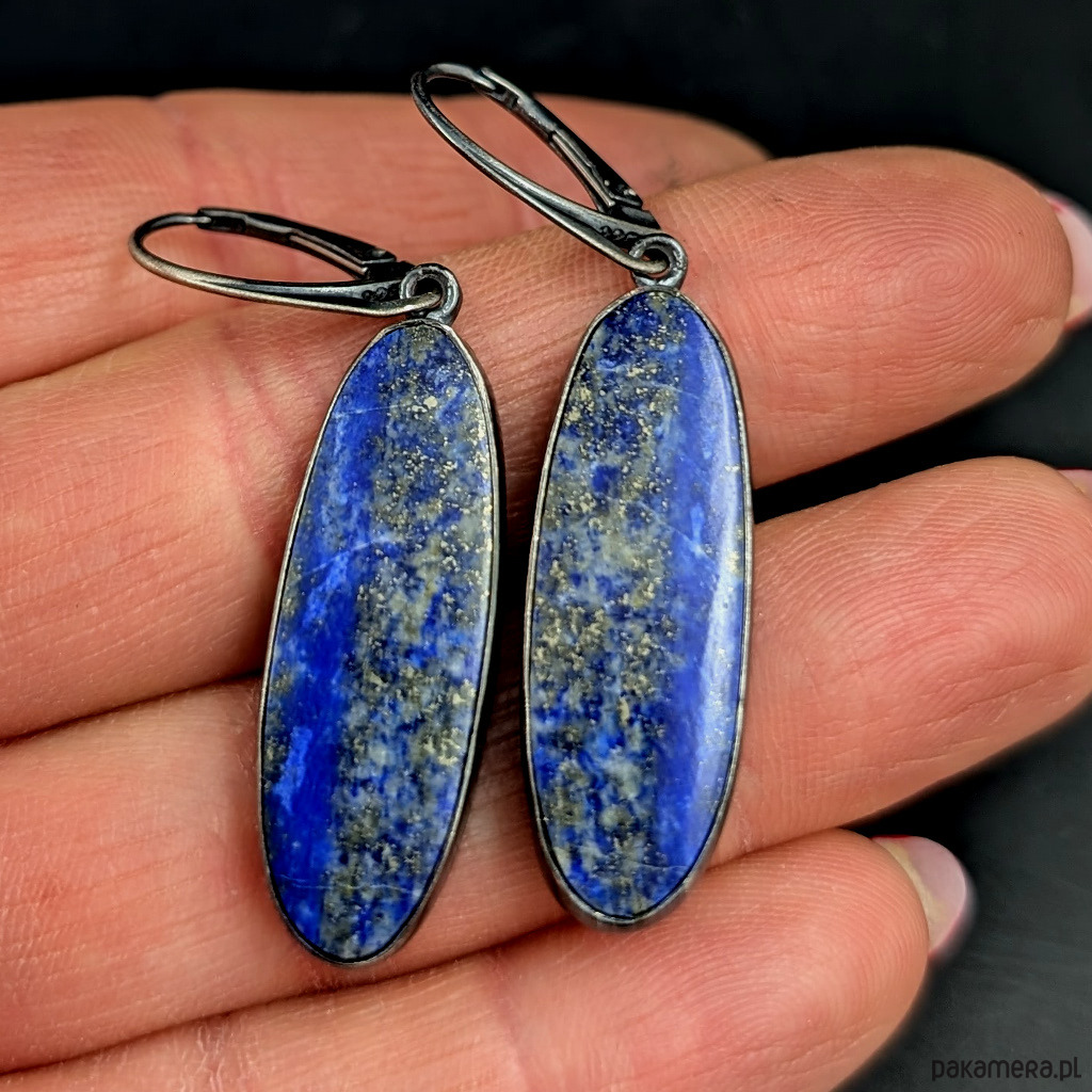 Lapis lazuli to piękna skała stworzona naturalnie z minerału azuryt z domieszkami licznych minerałów, z których najbardziej pożądany jest piryt. Od starożytności lapis lazuli zdobił biżuterię,a także wykorzystywany był jako materiał na przedmioty kultu, precjoza (np. maska grobowca Tutenchamona). Kolczyki z lapisem lazuli oprawionym w oksydowane srebro próby 925. Wymiary całej oprawy 32 x 11 mm. Długość z biglami 50 mm. Waga jednego 6,6 g. Zostaną zapakowane w ozdobne pudełeczko.