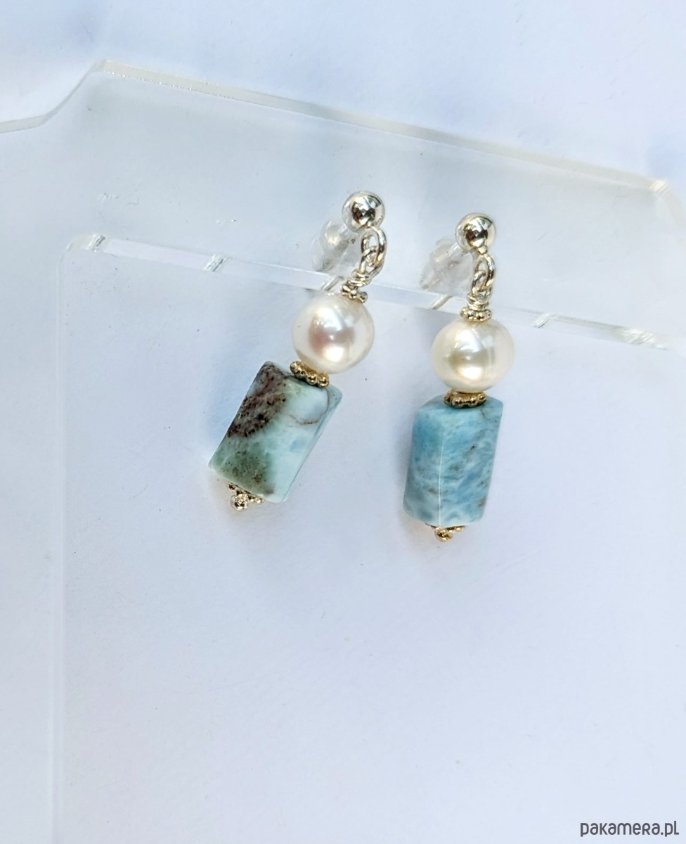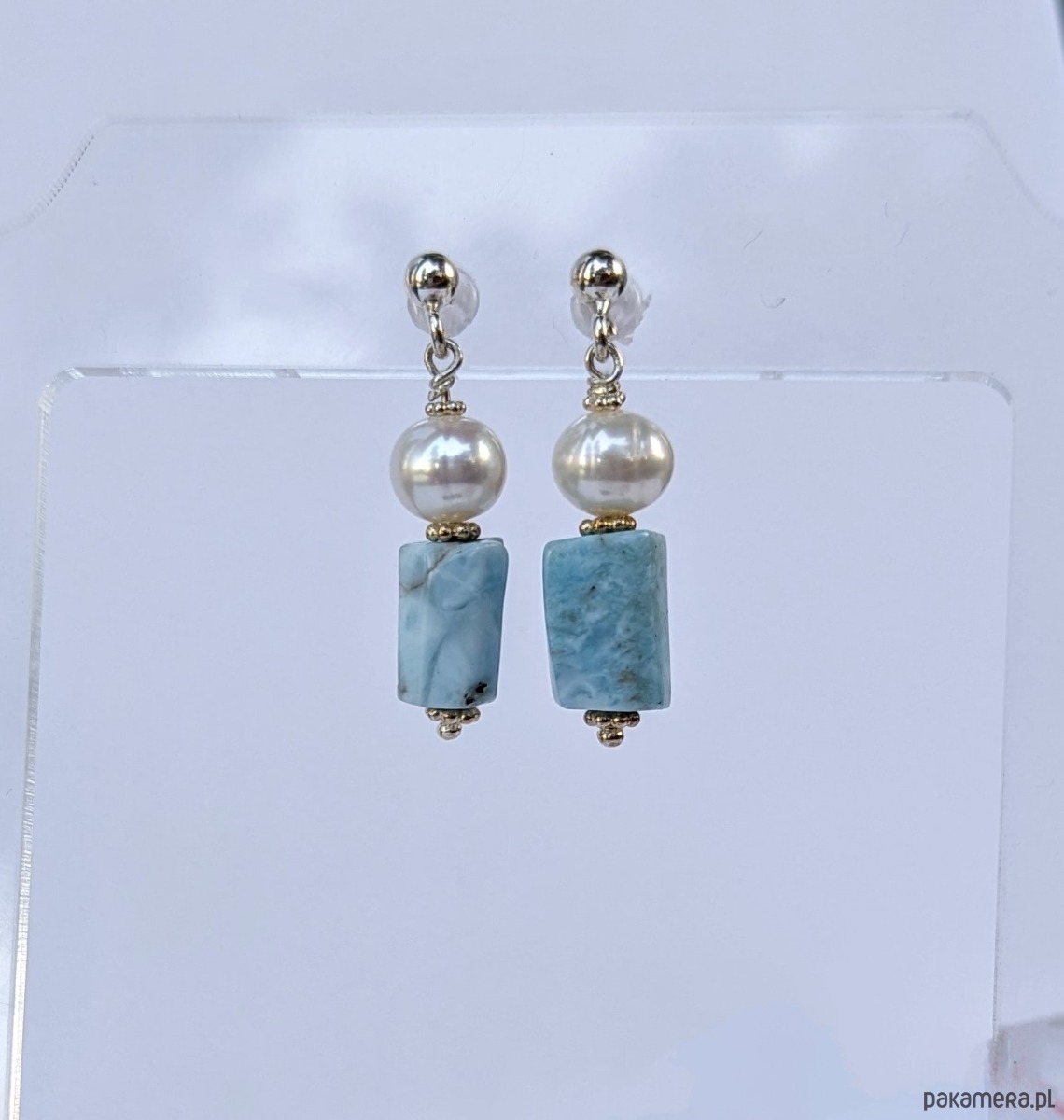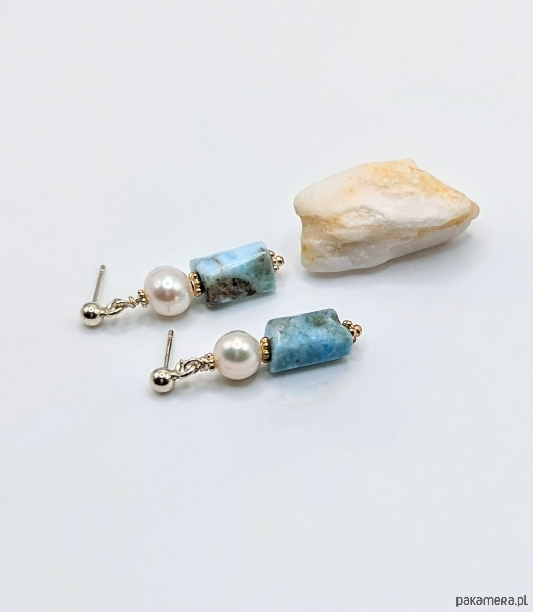 Kolczyki srebrne larimar z perłą