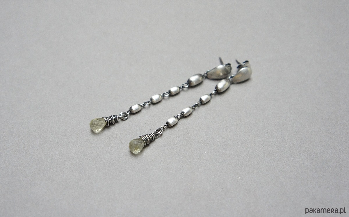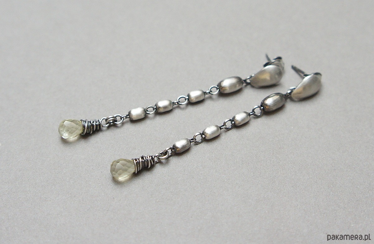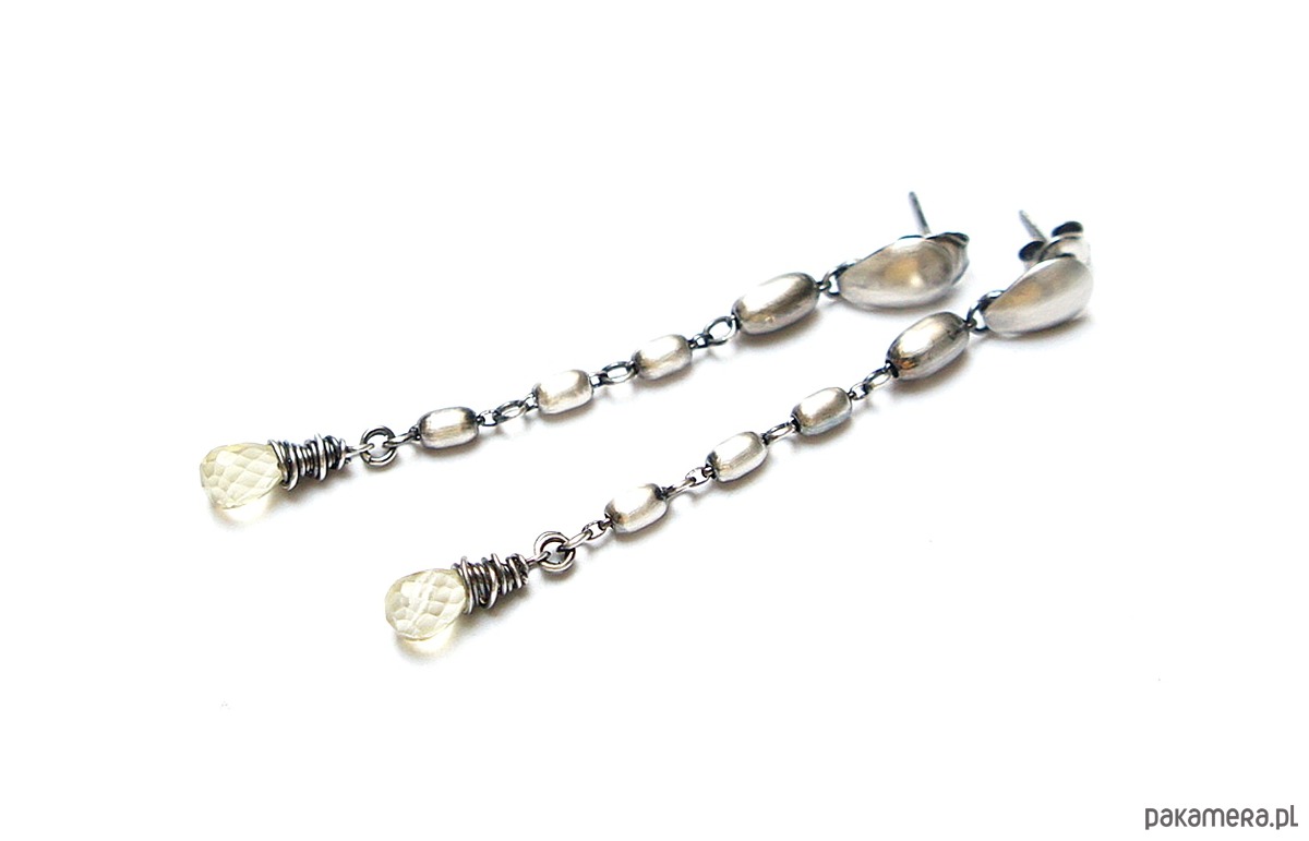 Kolczyki wykonane ze srebra [pr.925] w połączeniu ze srebrnymi oliwkami oraz brioletkami kwarców lemon [dł. 9mm]. Srebro oksydowane i przetarte. Całkowita długość kolczyków około 6,2cm. Biżuteria ozdobnie zapakowana.