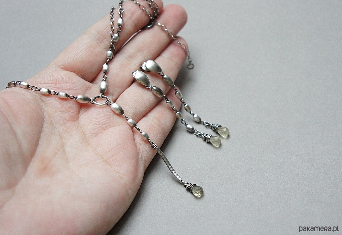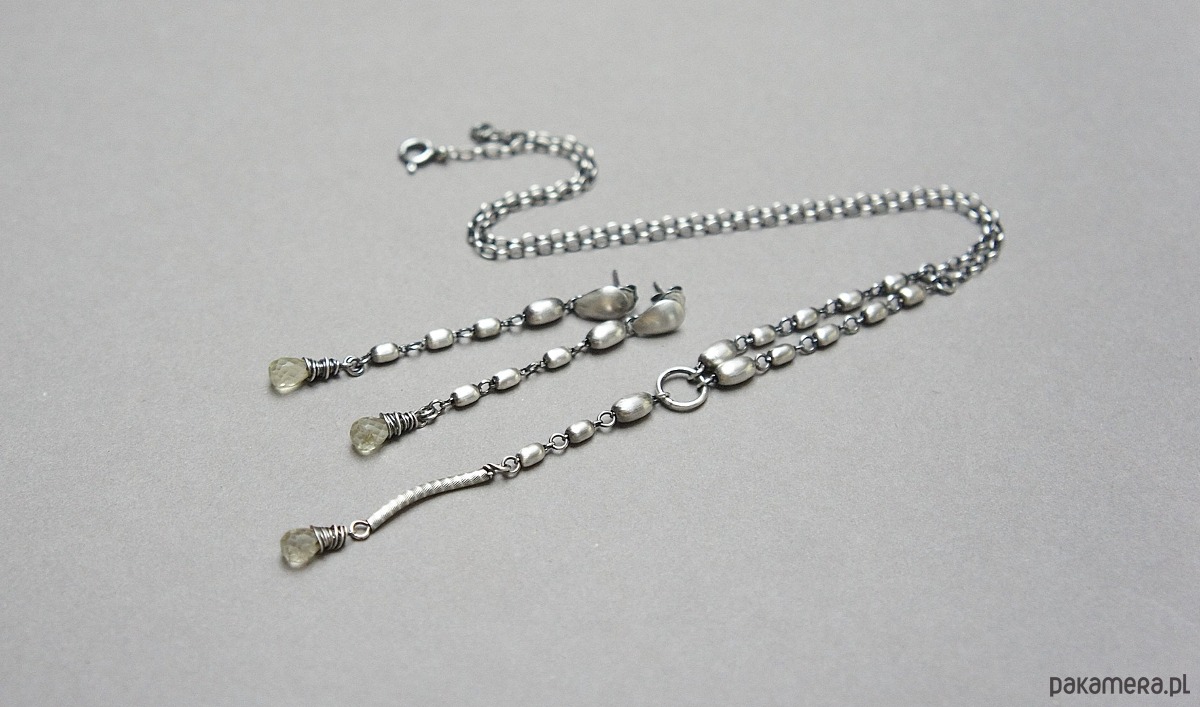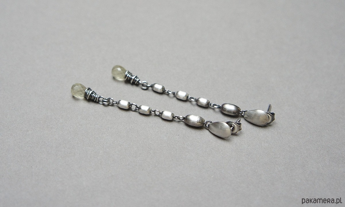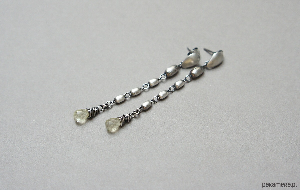 Kolczyki wykonane ze srebra [pr.925] w połączeniu ze srebrnymi oliwkami oraz brioletkami kwarców lemon [dł. 9mm]. Srebro oksydowane i przetarte. Całkowita długość kolczyków około 6,2cm. Biżuteria ozdobnie zapakowana.
