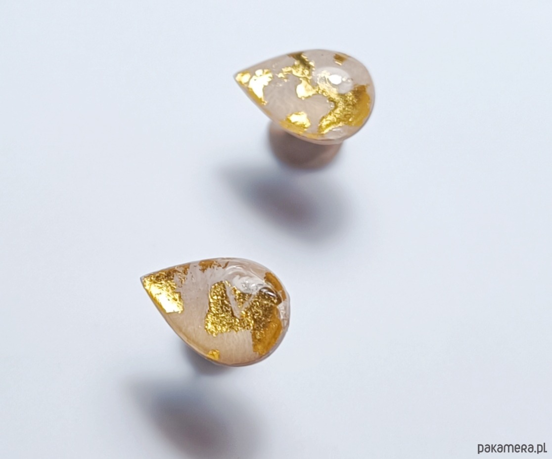 Kolczyki w kształcie łezki z 24 karatowym złotem i sztyftami ze srebra próby 925. Wykonane ręcznie.