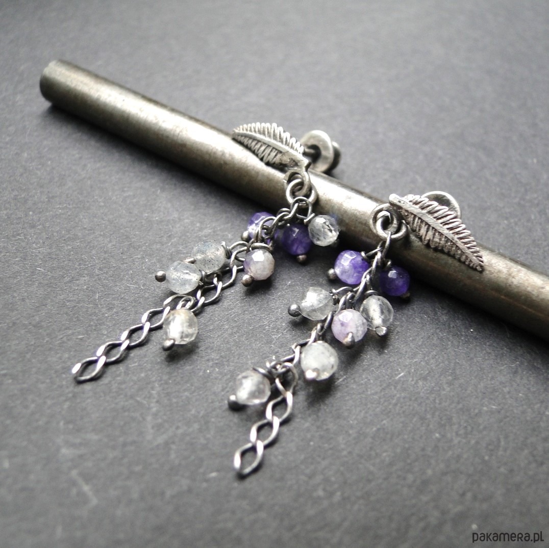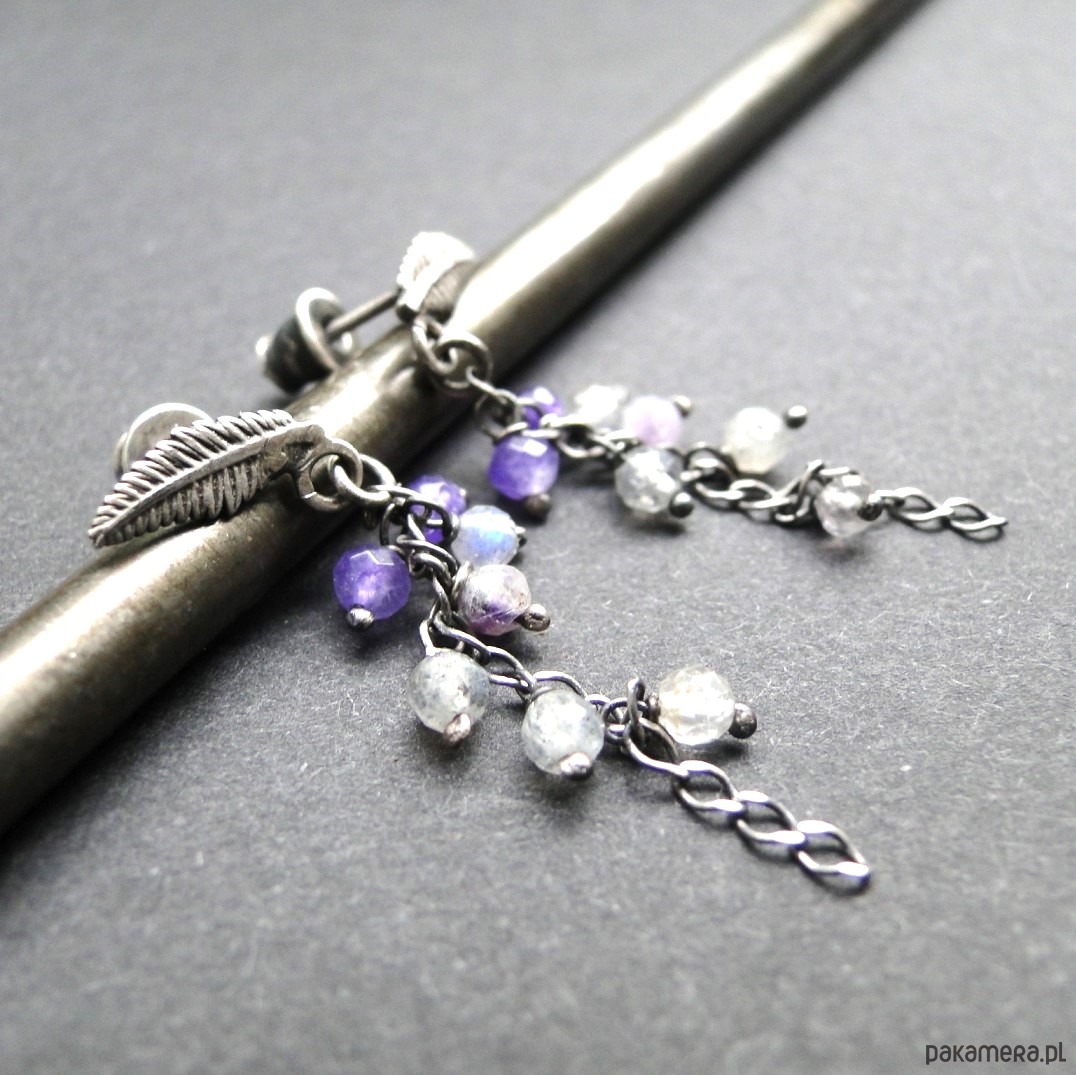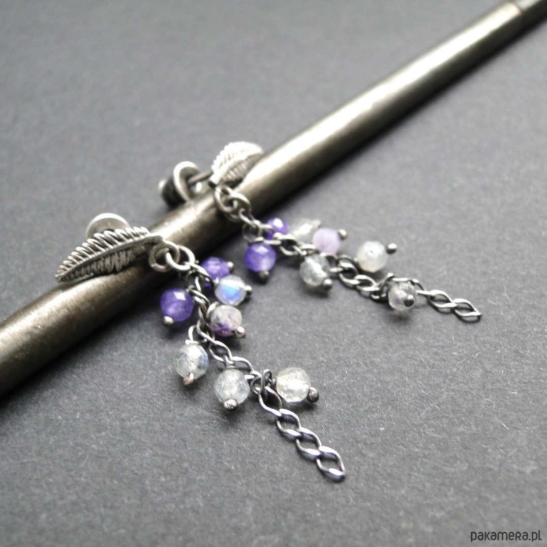 Subtelne, drobne kolczyki.Srebro 925,oksydowane i szorowane. Srebrne liście jako sztyfty z zatyczką. Kamienie: labradoryt,fluoryt i agat śr.3 mm. Długość kolczyka= 3,5 cm. Pojedynczy egzemplarz.