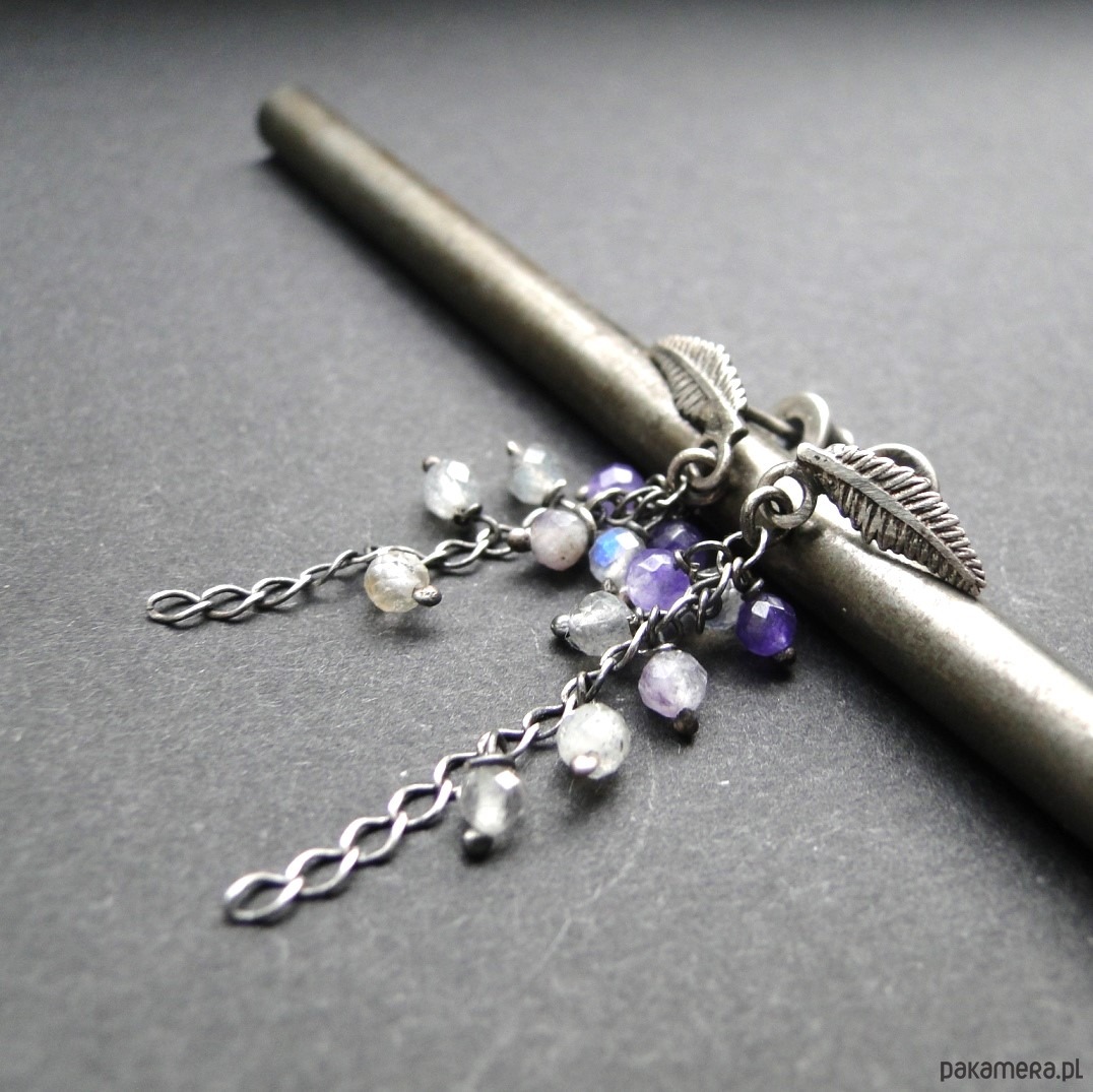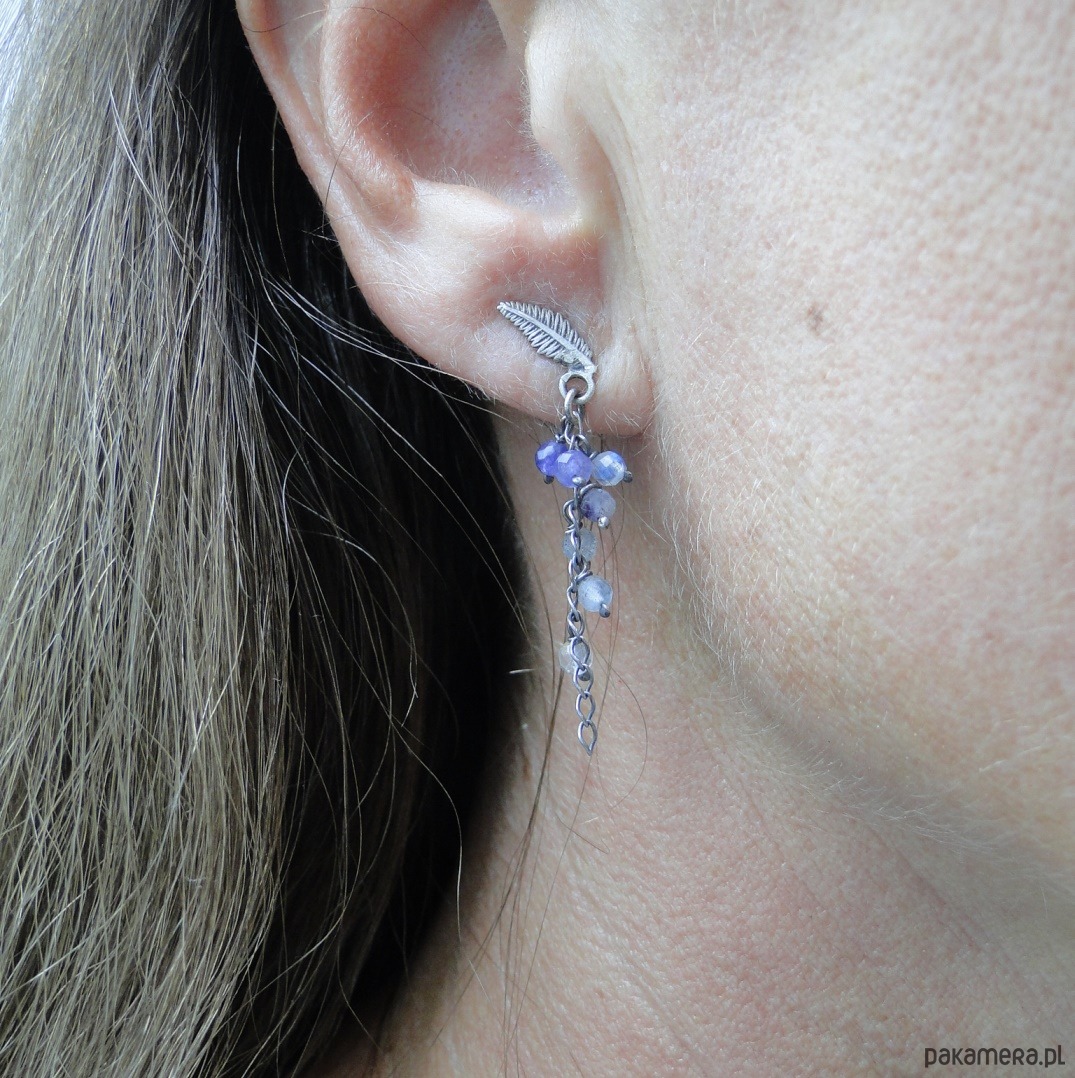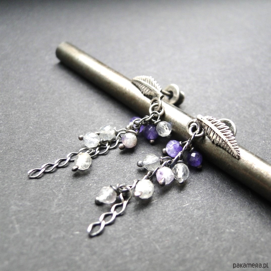 Subtelne, drobne kolczyki.Srebro 925,oksydowane i szorowane. Srebrne liście jako sztyfty z zatyczką. Kamienie: labradoryt,fluoryt i agat śr.3 mm. Długość kolczyka= 3,5 cm. Pojedynczy egzemplarz.