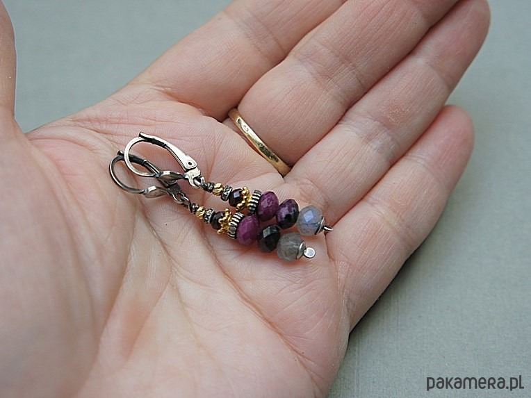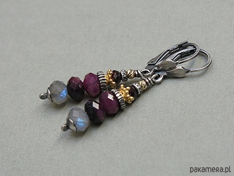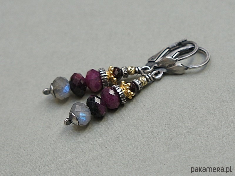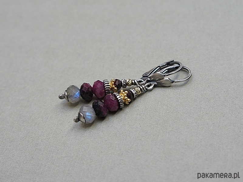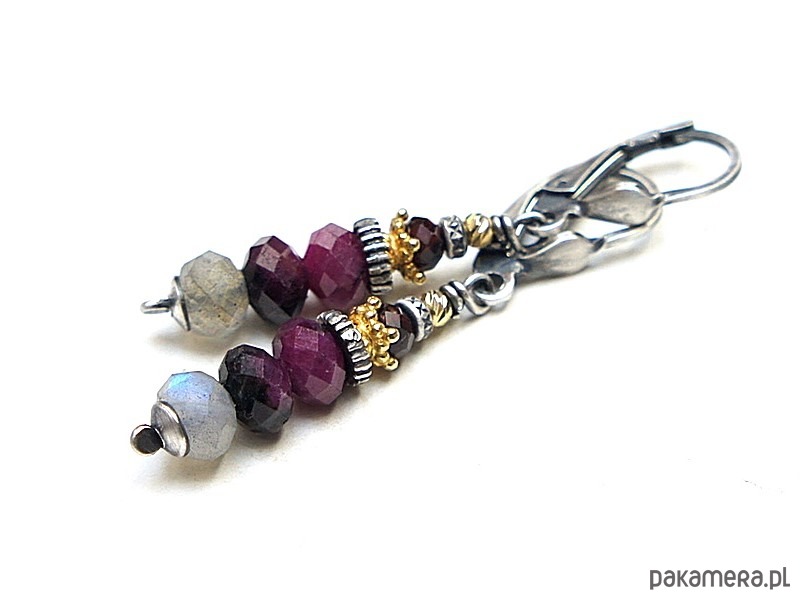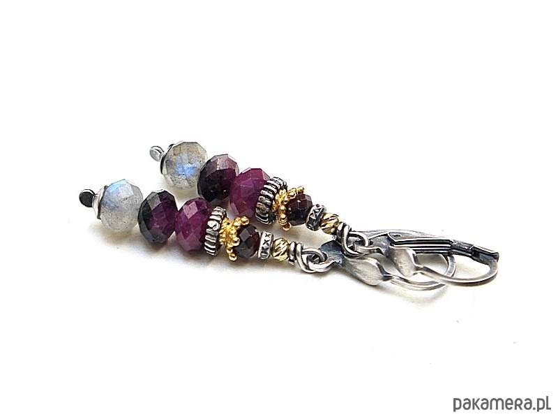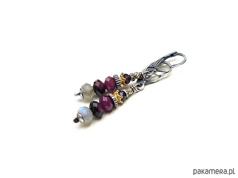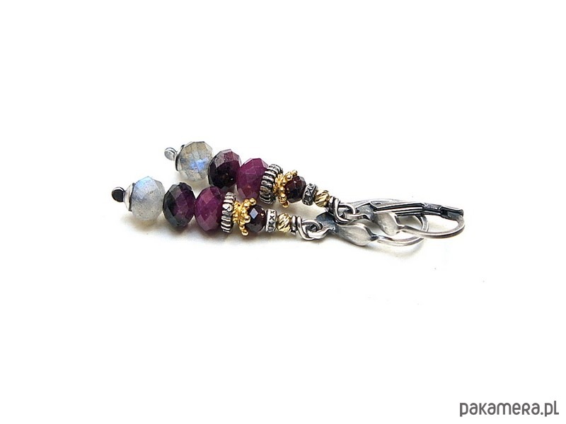 Kolczyki wykonane w całości ze srebra i srebro pokrytego 24k złotem [pr. 925] w połączeniu z fasetowanymi oponkami rubinów [6mm], fasetowanymi oponkami labradorytów [6mm], fasetowanymi kuleczkami granatów [3mm]. Całkowita długość kolczyków: 4,5cm. Biżuteria ozdobnie zapakowana.