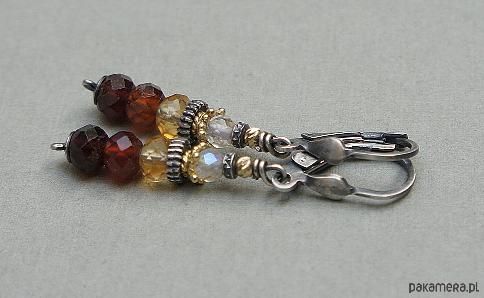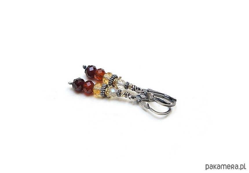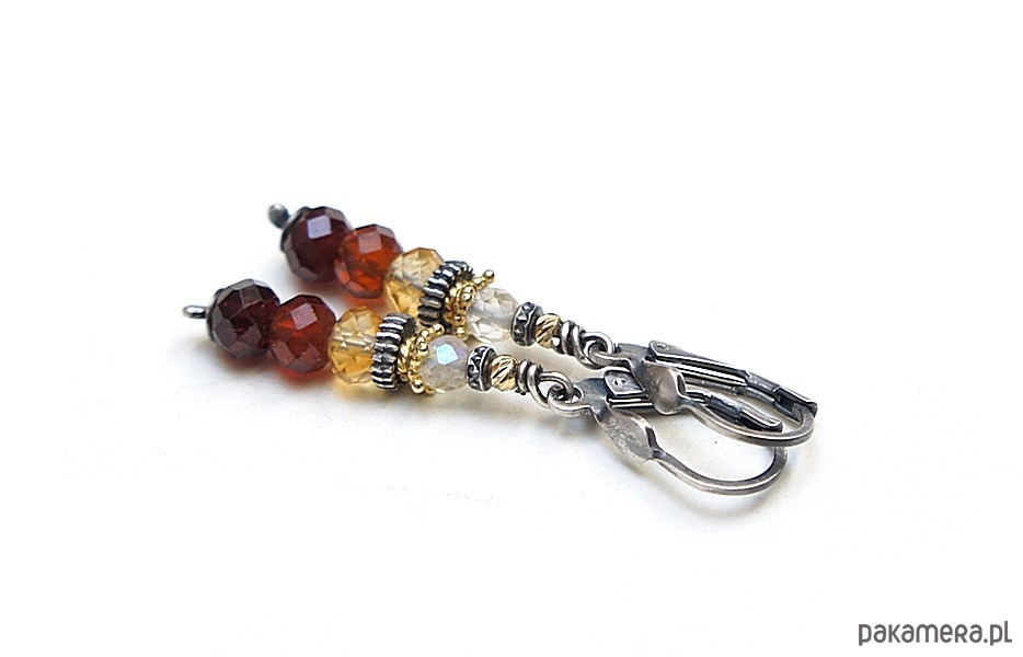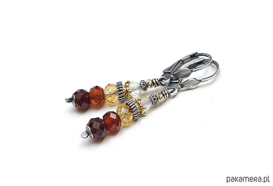 Kolczyki wykonane w całości ze srebra i srebra pokrytego 24k złotem [pr. 925] w połączeniu z fasetowanymi oponkami granatów [6mm], fasetowanymi oponkami cytrynów [6mm], fasetowanymi kuleczkami kamieni księżycowych [4mm]. Całkowita długość kolczyków: 4,5cm. Biżuteria ozdobnie zapakowana.
