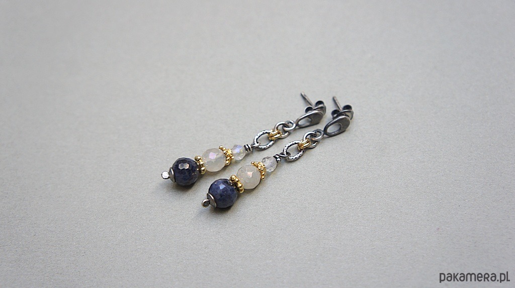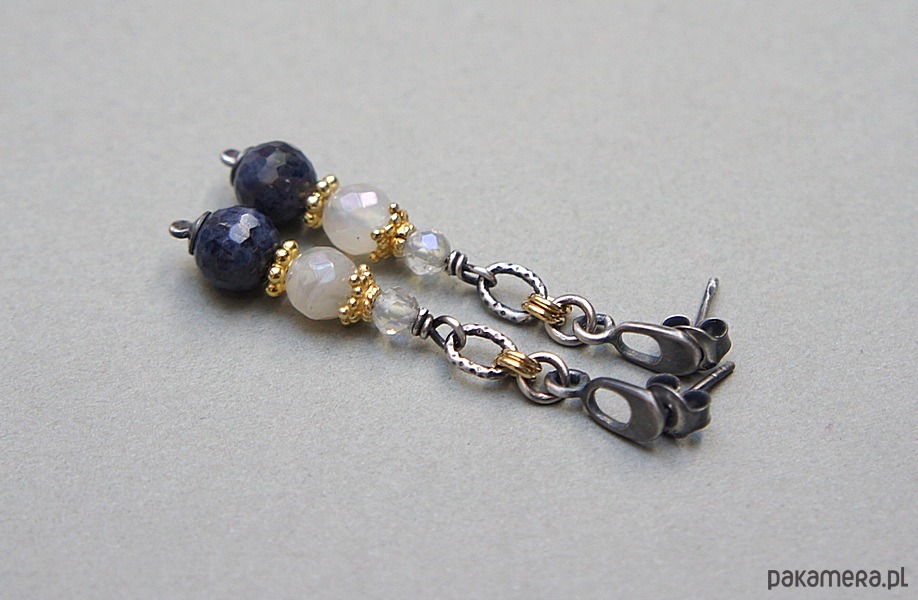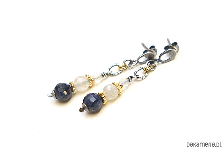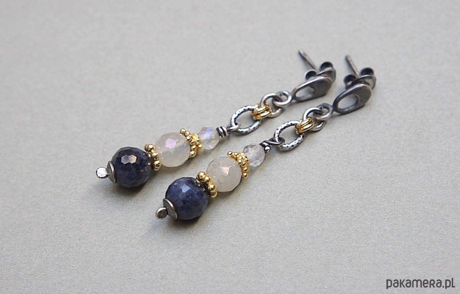 Kolczyki wykonane ze srebra i srebra pokrytego 24k złotem [pr.925] w połączeniu z fasetowanymi kuleczkami szafirów [7,5mm], kuleczkami kamieni księżycowych z powłoka mystic [6mm], fasetowanymi kamieniami księżycowymi [4mm] oraz przekładkami bali. Srebro częściowo oksydowane i przetarte. Całkowita długość kolczyków 4,5cm. Biżuteria ozdobnie zapakowana.