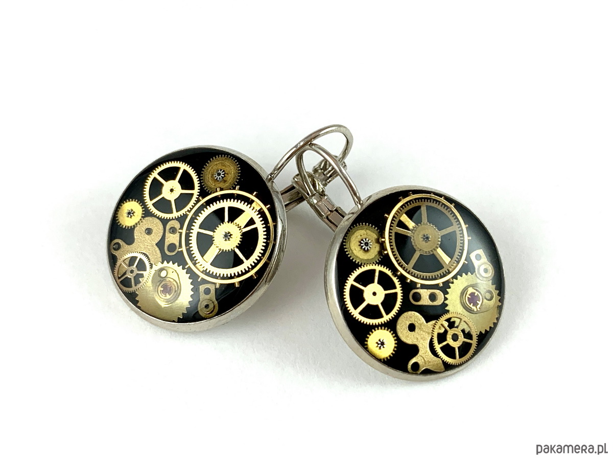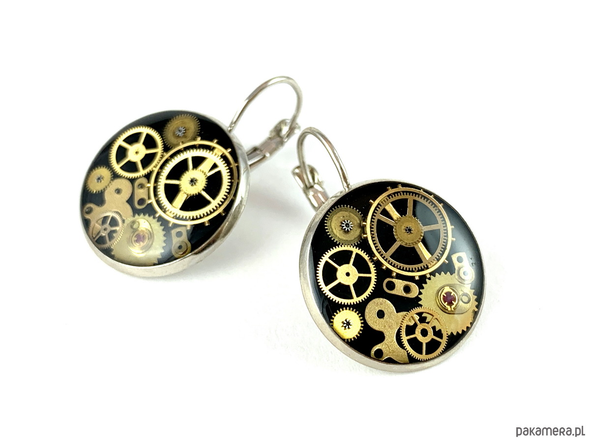 Przepiękne kolczyki, wykonane ręcznie z elementów starych zegarków zatopionych w żywicy. Każda para jest unikalna i niepowtarzalna.
