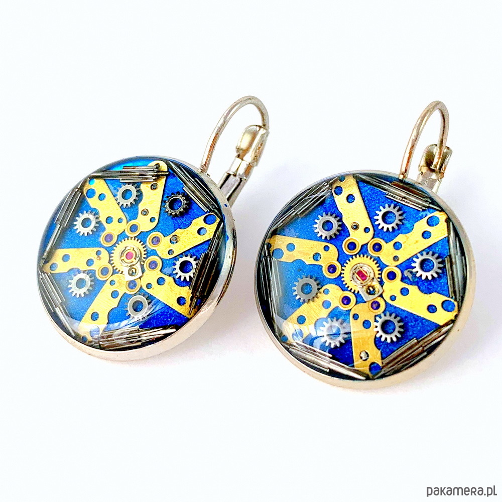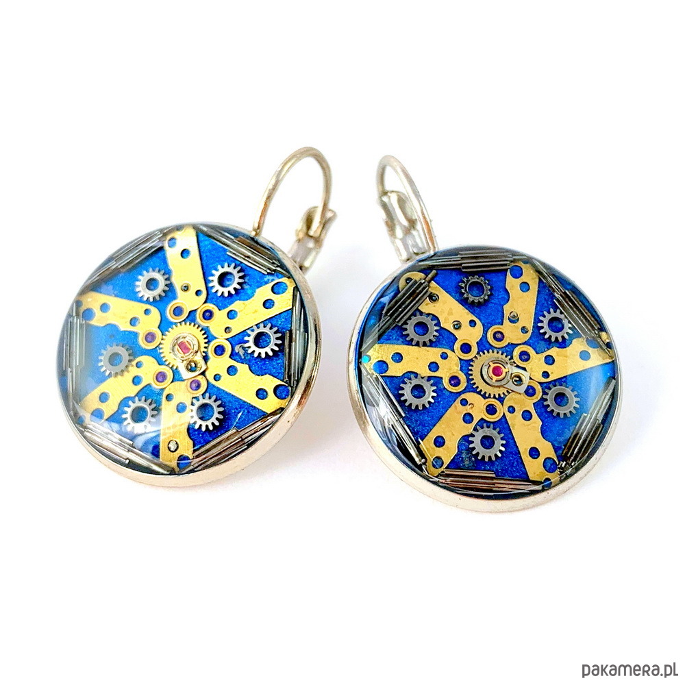 Przepiękne kolczyki, wykonane ręcznie z elementów starych zegarków zatopionych w żywicy. Każda para jest unikalna i niepowtarzalna.