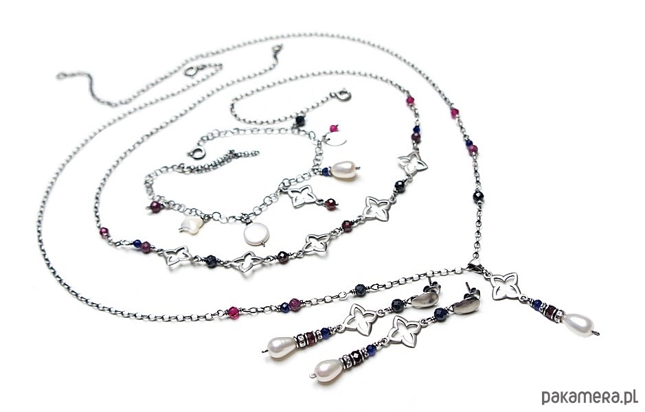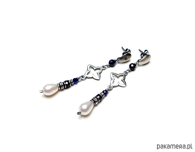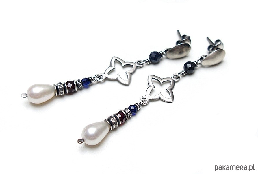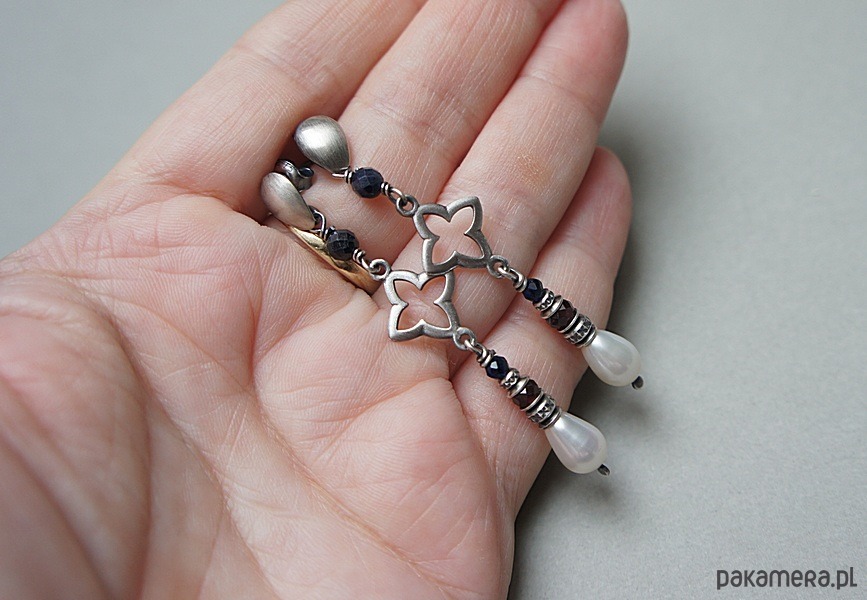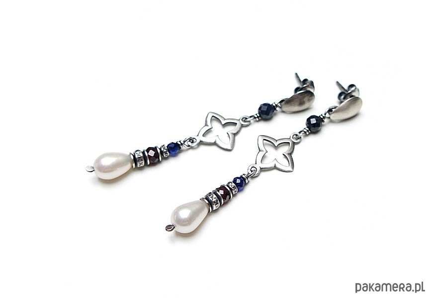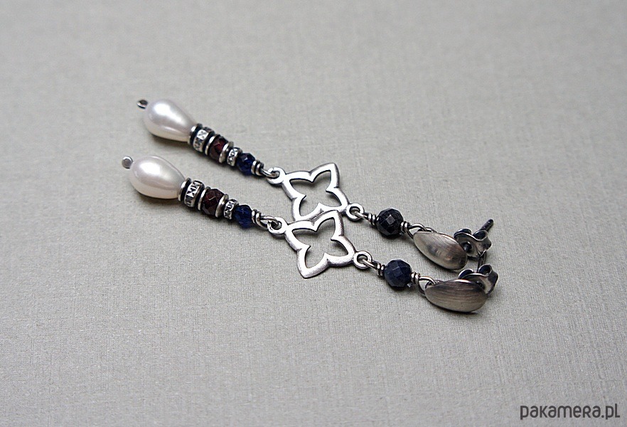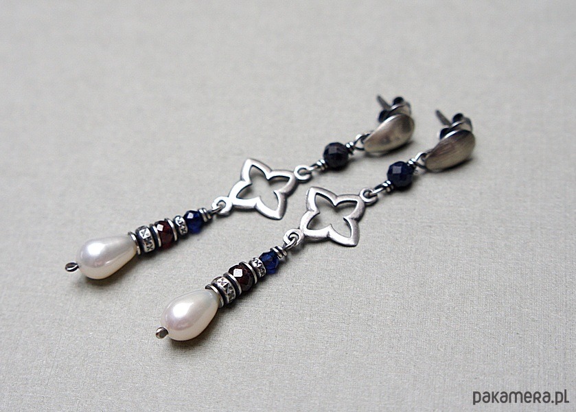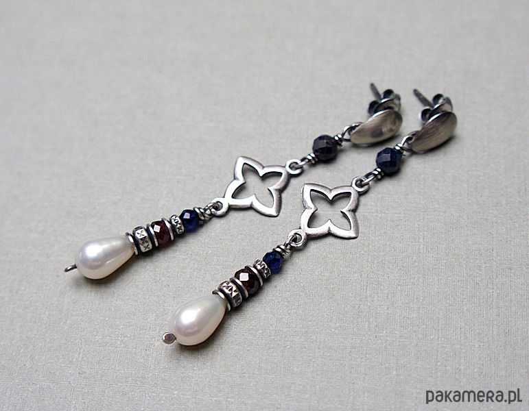Kolczyki wykonane ze srebra [pr. 925] w połączeniu z kroplami naturalnych pereł [10mm], fasetowanymi kuleczkami naturalnych szafirów i granatów [4mm], kuleczkami szafirków [3mm - klarowane]. Srebro oksydowane i przetarte. Całkowita długość kolczyków: 6,3cm.