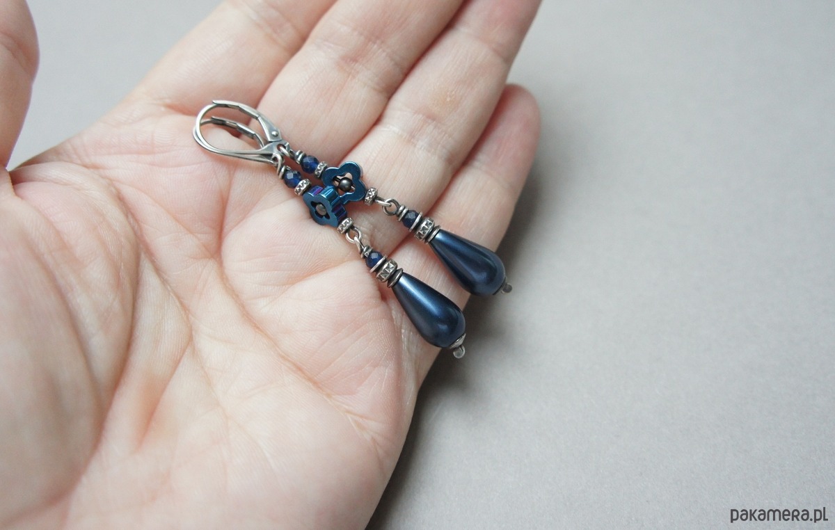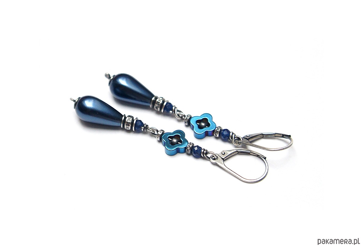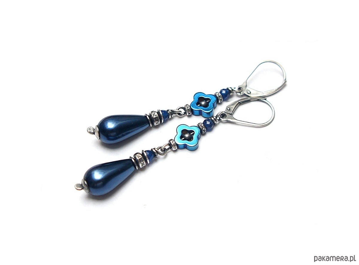 Kolczyki wykonane ze srebra [pr. 925] w połączeniu z kroplami czeskich pereł [14mm], fasetowanymi kuleczkami szafirów [2mm -syntetyczne], oraz hematytowymi koniczynkami . Srebro oksydowane i przetarte. Całkowita długość kolczyków: 6,1cm.