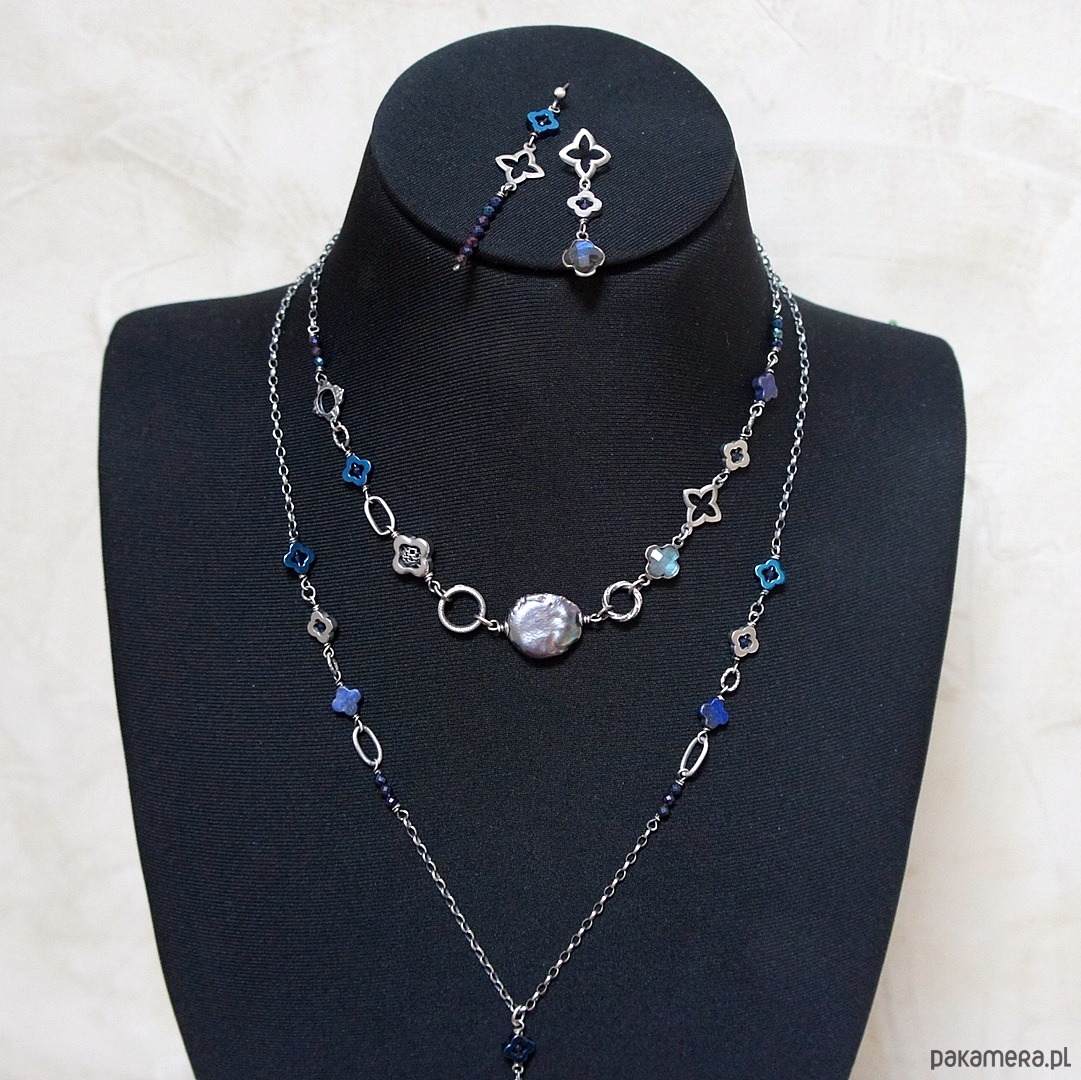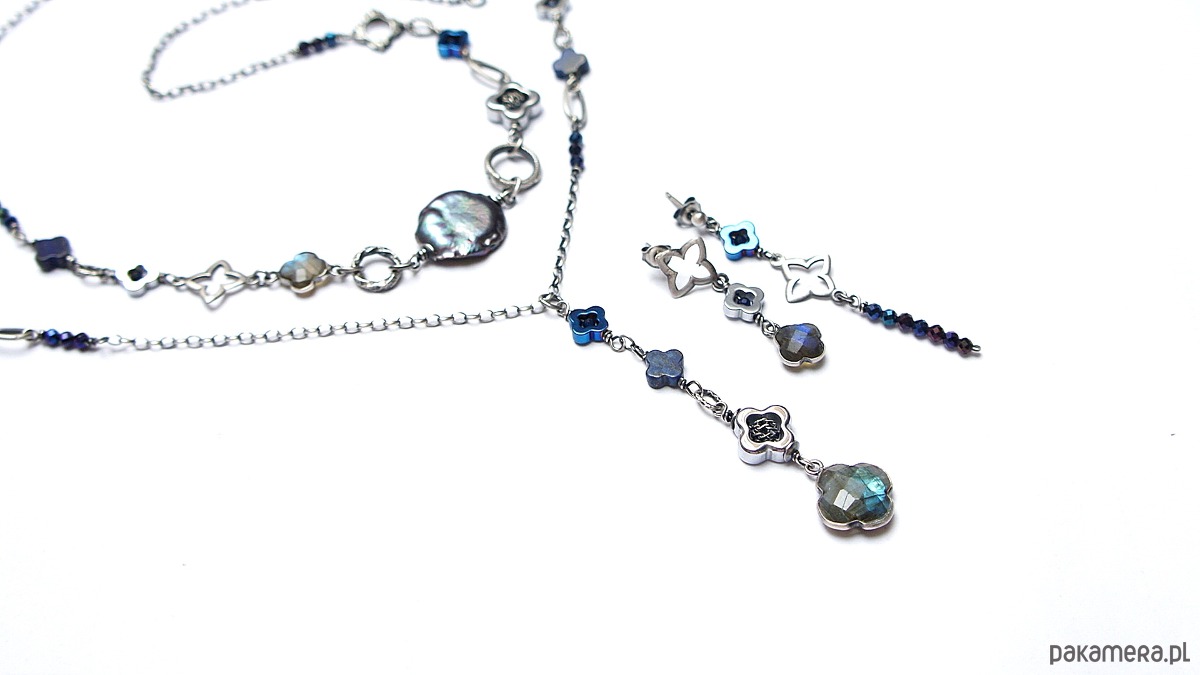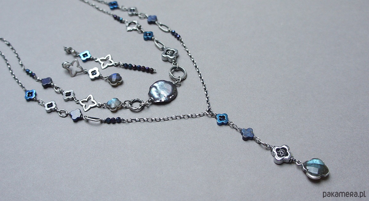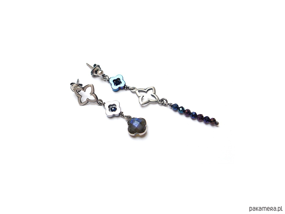Kolczyki asymetryczne wykonane ze srebra [pr. 925] w połączeniu z fasetowanymi kuleczkami spineli mystic [3mm ], koniczynką labradorytu w okuciu ,fasetowanymi szafirami [2mm-syntetyczne] oraz hematytowymi koniczynkami . Srebro oksydowane i przetarte. Całkowita długość kolczyków: 6,3cm i 4,2cm.