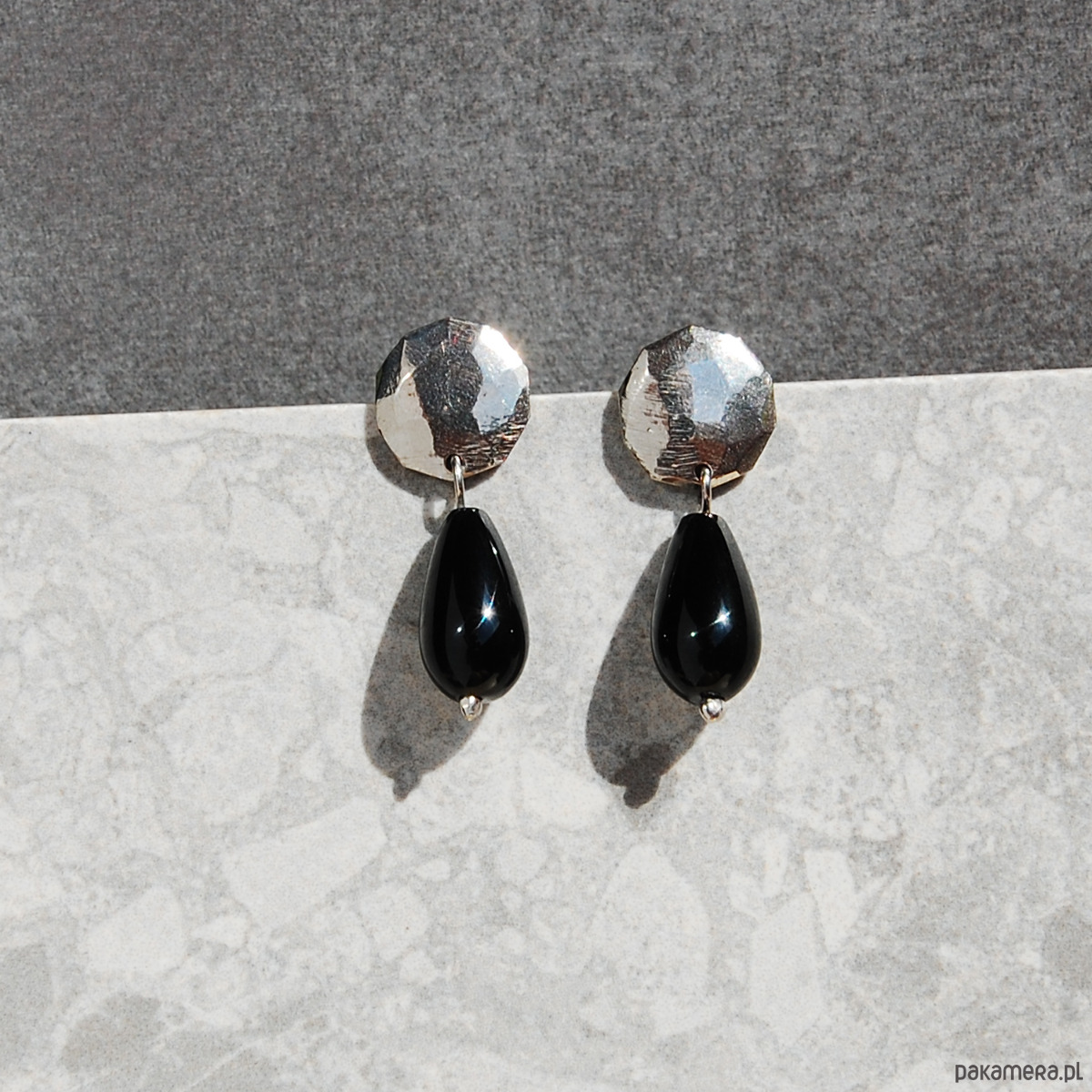 Klasyczne srebrne kolczyki medaliony wykonane w srebrze próby 925 w surowym wykończeniu oraz naturalnego onyksu szlifowanego w kształt kropli. Pokryte są platyną, dzięki czemu srebro nie ciemnieje.