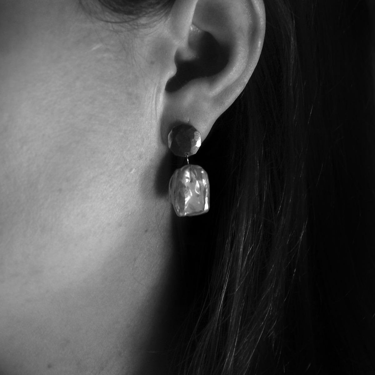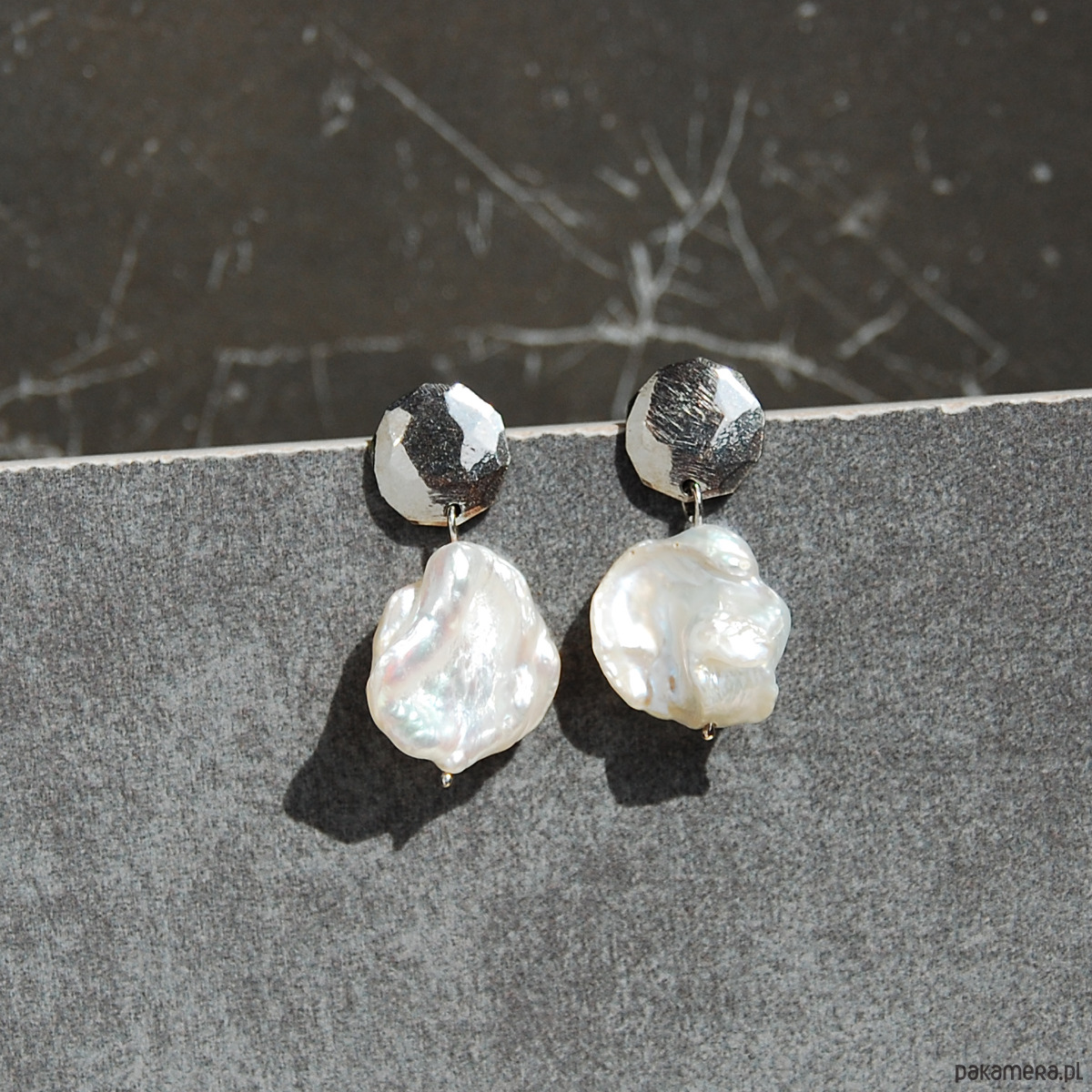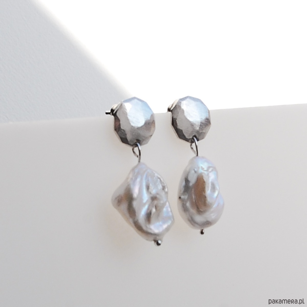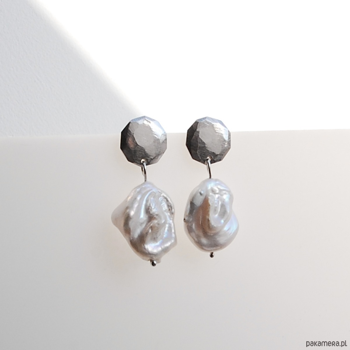 Klasyczne srebrne kolczyki medaliony wykonane w srebrze próby 925 w surowym wykończeniu oraz naturalnych pereł hodowlanych. Dostępne w żóltym złoceniu lub pokryte rodem, dzięki czemu srebro nie ciemnieje.