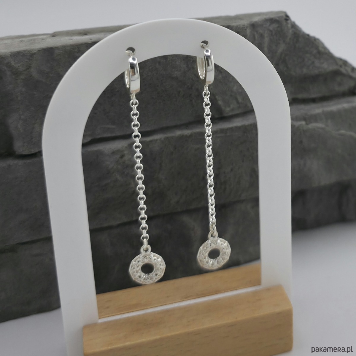 Kobiece, subtelne, eleganckie kolczyki odpowiednie na dzień i na wieczór. Wykonane w całości ze srebra próby 925. Zapięcia masywne, zatrzaskowe kajdanki. Całkowita długość kolczyków to ok. 7 cm, rozety maja srednice ok.1 cm. Na życzenie moge kolczyki skrócić lub wydłużyć. Ozdobnie zapakowane.