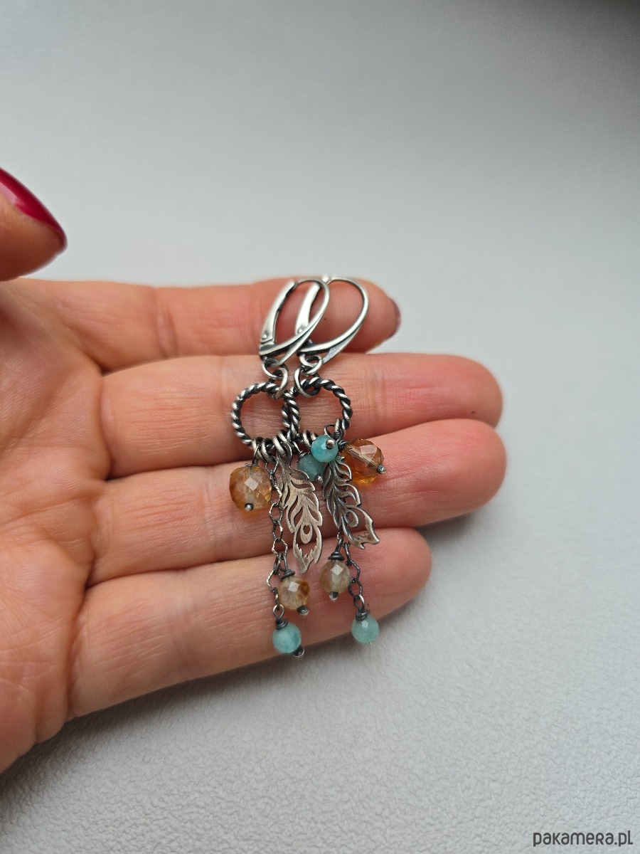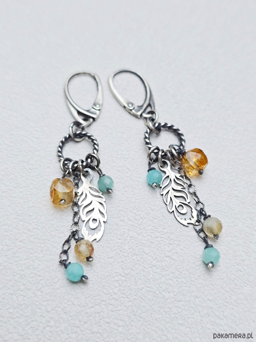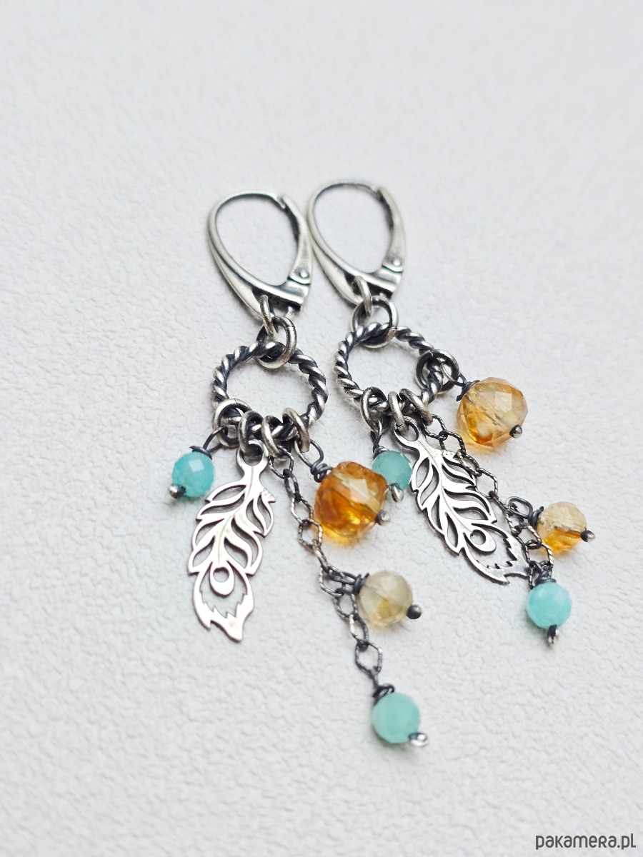 Wyjątkowe, lekkie kolczyki na biglach angielskich z niebieskimi amazonitami , cytrynami oraz zawieszkami w kształcie piórek.