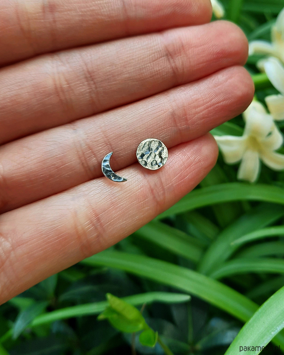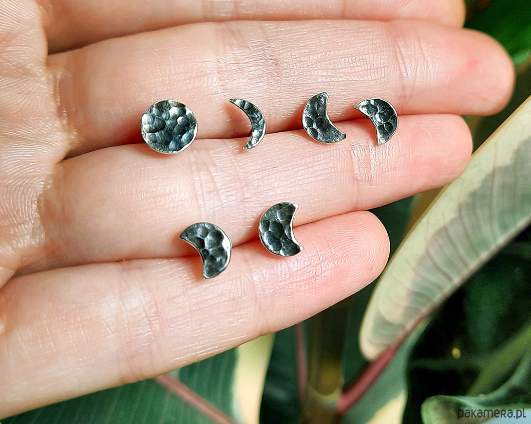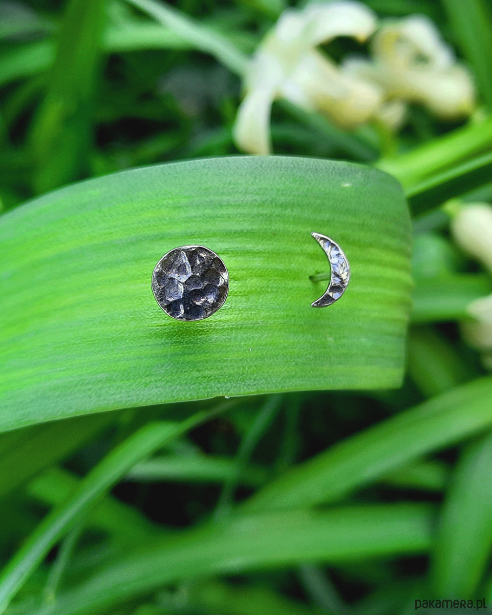 Kolczyki MOON Pełnia i Sierp - to komplet sztyftów w kształcie dwóch faz księżyca . Są delikatnym, acz bardzo charakterystycznym akcentem . Stworzyłam je ze srebra próby 925, obniżenia faktury zaczerniłam, by nadać kontrast.