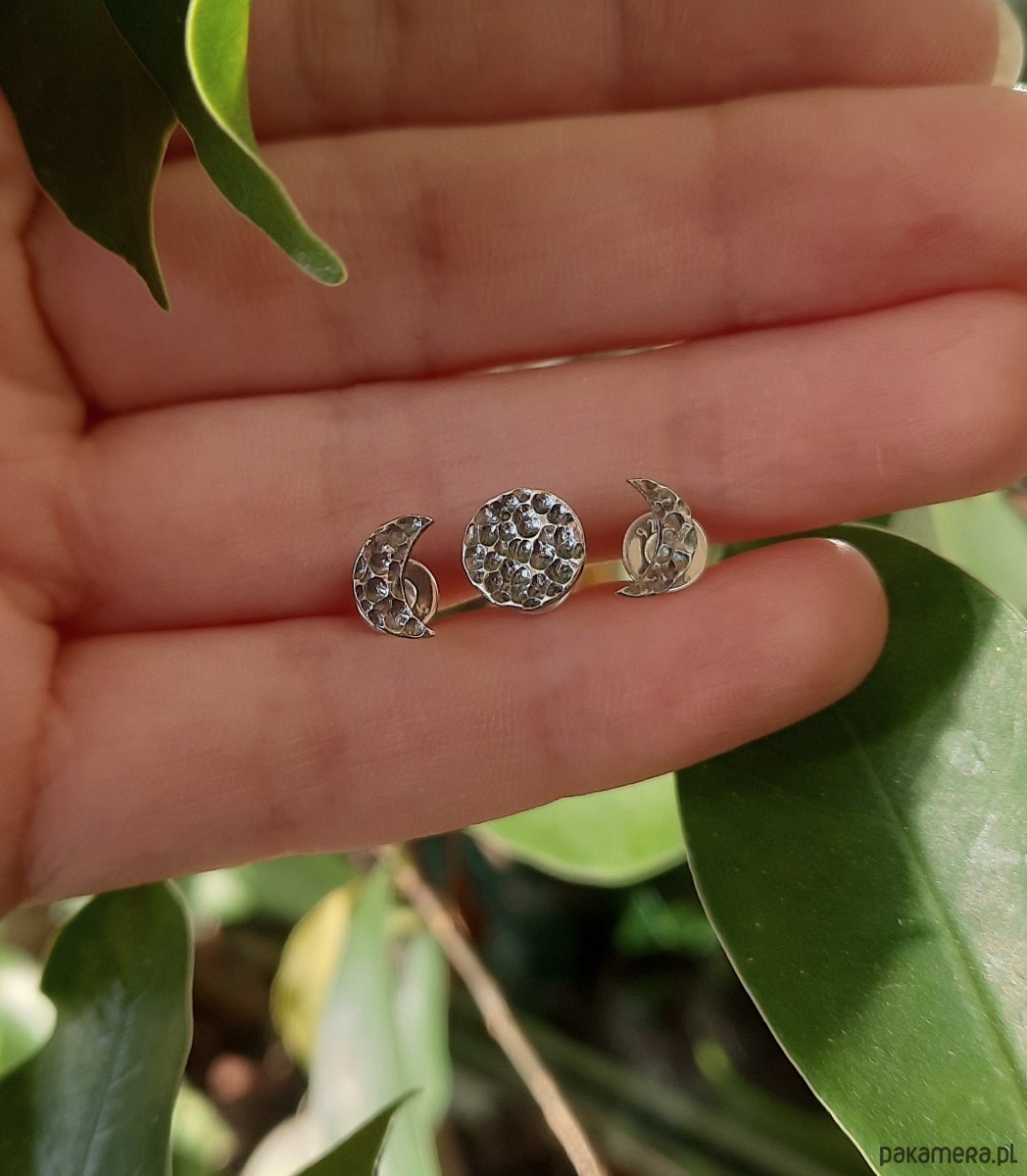 Kolczyki MOON Pełnia i Sierpy - to komplet trzech sztyftów w kształcie dwóch faz księżyca . Są delikatnym, acz bardzo charakterystycznym akcentem . Stworzyłam je ze srebra próby 925, obniżenia faktury zaczerniłam, by nadać kontrast.