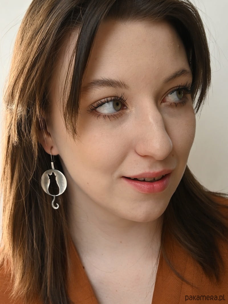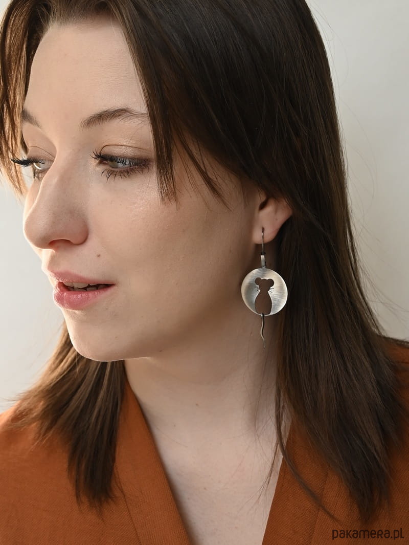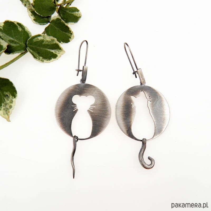 Niezwykłe kolczyki wykonane w całości ze srebra próby 925 z kotkiem i myszką.