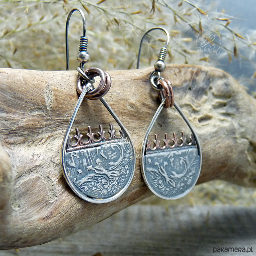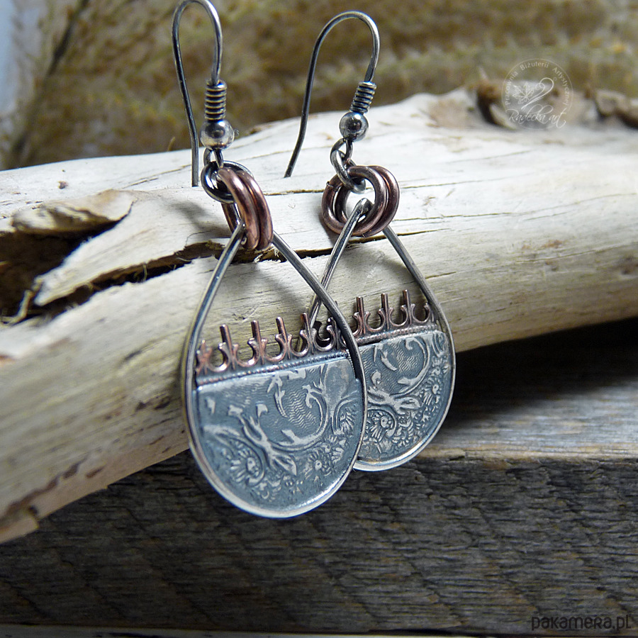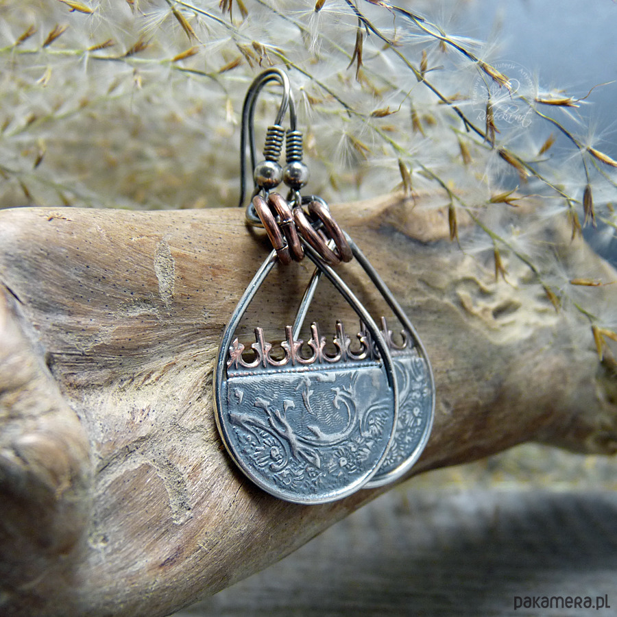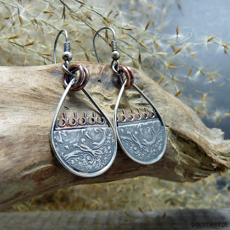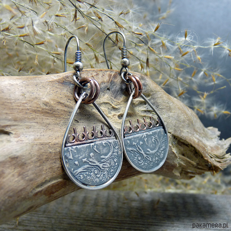Ciekawe kolczyki w stylu boho powstały w wyniku mieszanki metali takich jak: brąz, miedź oraz srebro. Motywy folkowe zostały wykonane z oksydowanego srebra najwyższej jakości. Srebro oksydowane i przetarte. Długość całkowita wynosi 48 mm. Wszystkie moje prace wysyłam w eleganckim pudełeczku jubilerskim. Gorąco polecam.