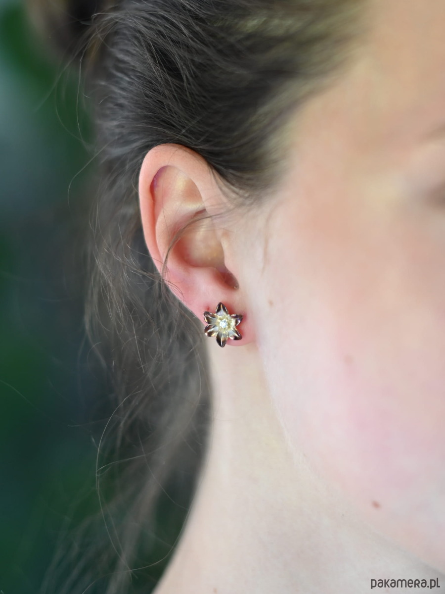 W samym sercu każdego kwiatuszka zakwitła biała cyrkonia – subtelny akcent światła i czystości, przypominający o tym, co kruche, a zarazem trwałe: pamięć, czułość, pierwsze spojrzenia.