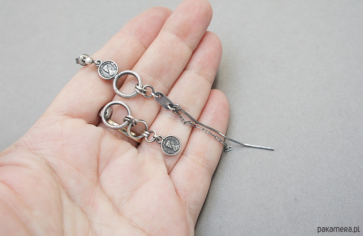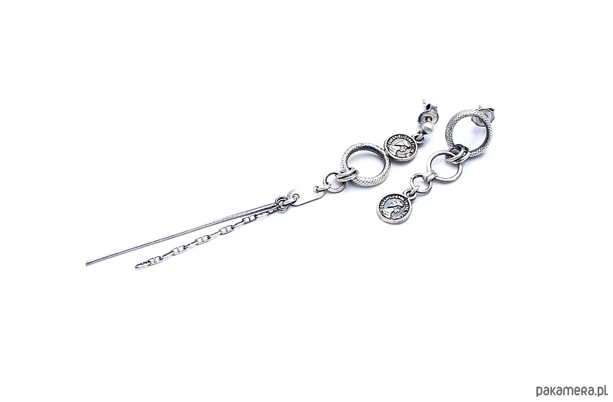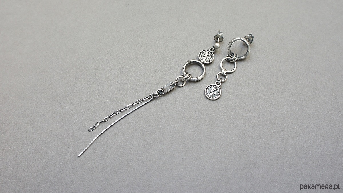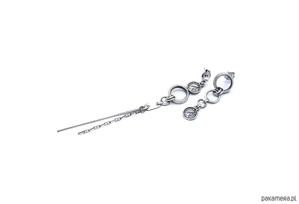 Asymetryczne kolczyki wykonane ze srebra [pr. 925] w połączeniu ze srebrnymi imitacjami monet . Srebro częściowo oksydowane i przetarte. Długość kolczyków 9cm i 3,8cm. Biżuteria ozdobnie zapakowana.