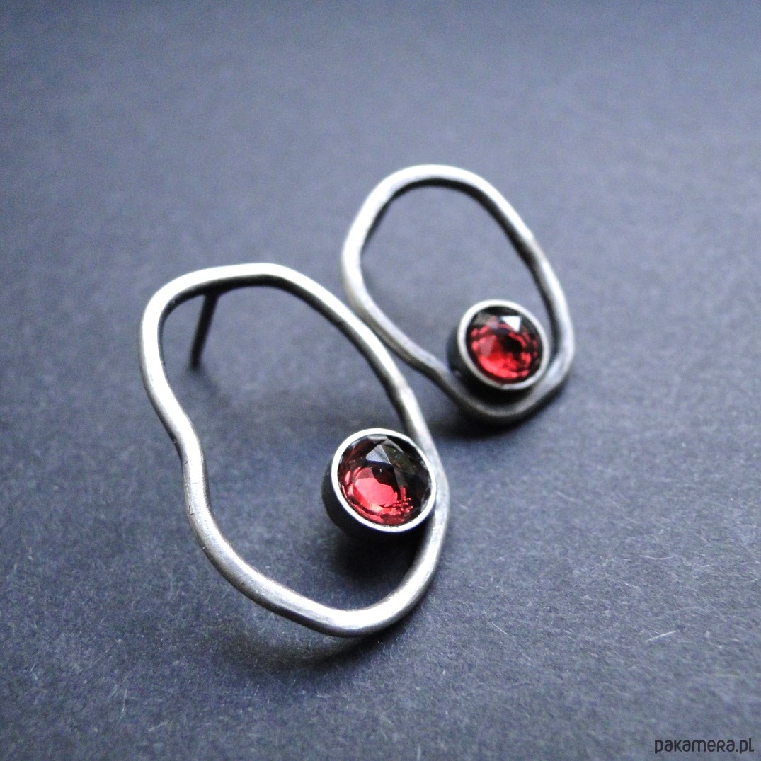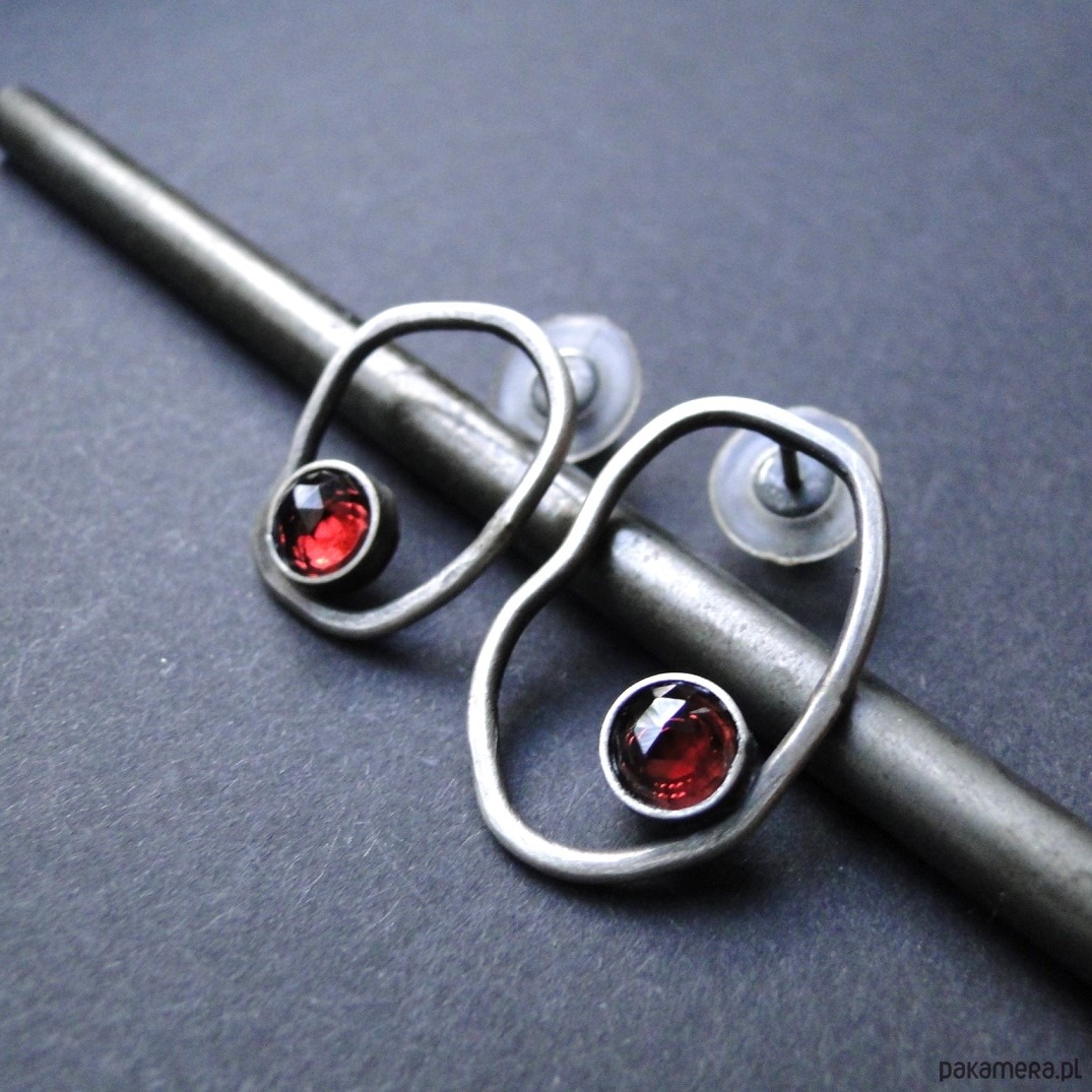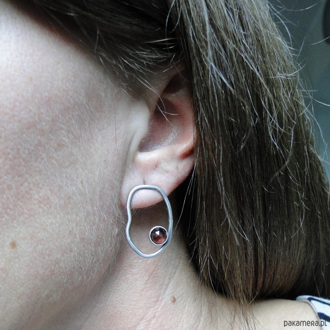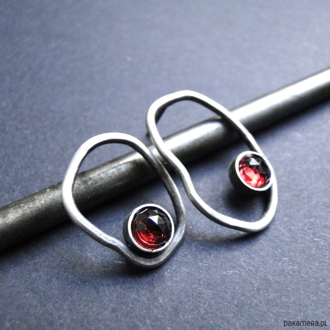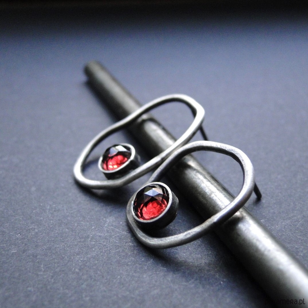 Nowoczesne kolczyki w modnym kształcie. Srebro pr.925,oksydowane i szorowane. Kamienie: naturalne granaty klasy A,pięknie fasetowane,śr.6mm. Zapięcia na sztyfty. Długość: jeden 3 cm ,drugi 2 cm. Nie moczyć w wodzie. Polecam pierścień do zestawu (jedyny).